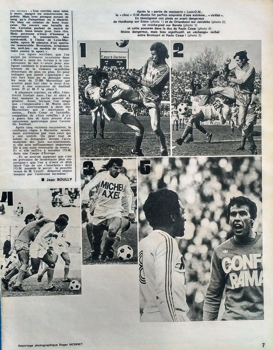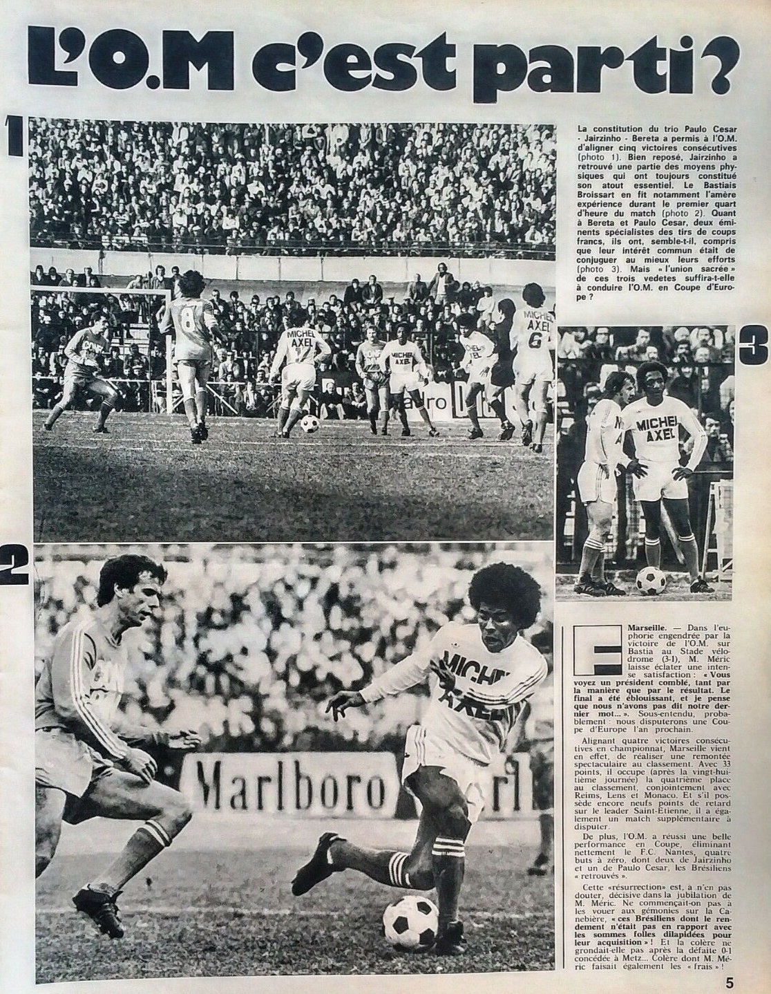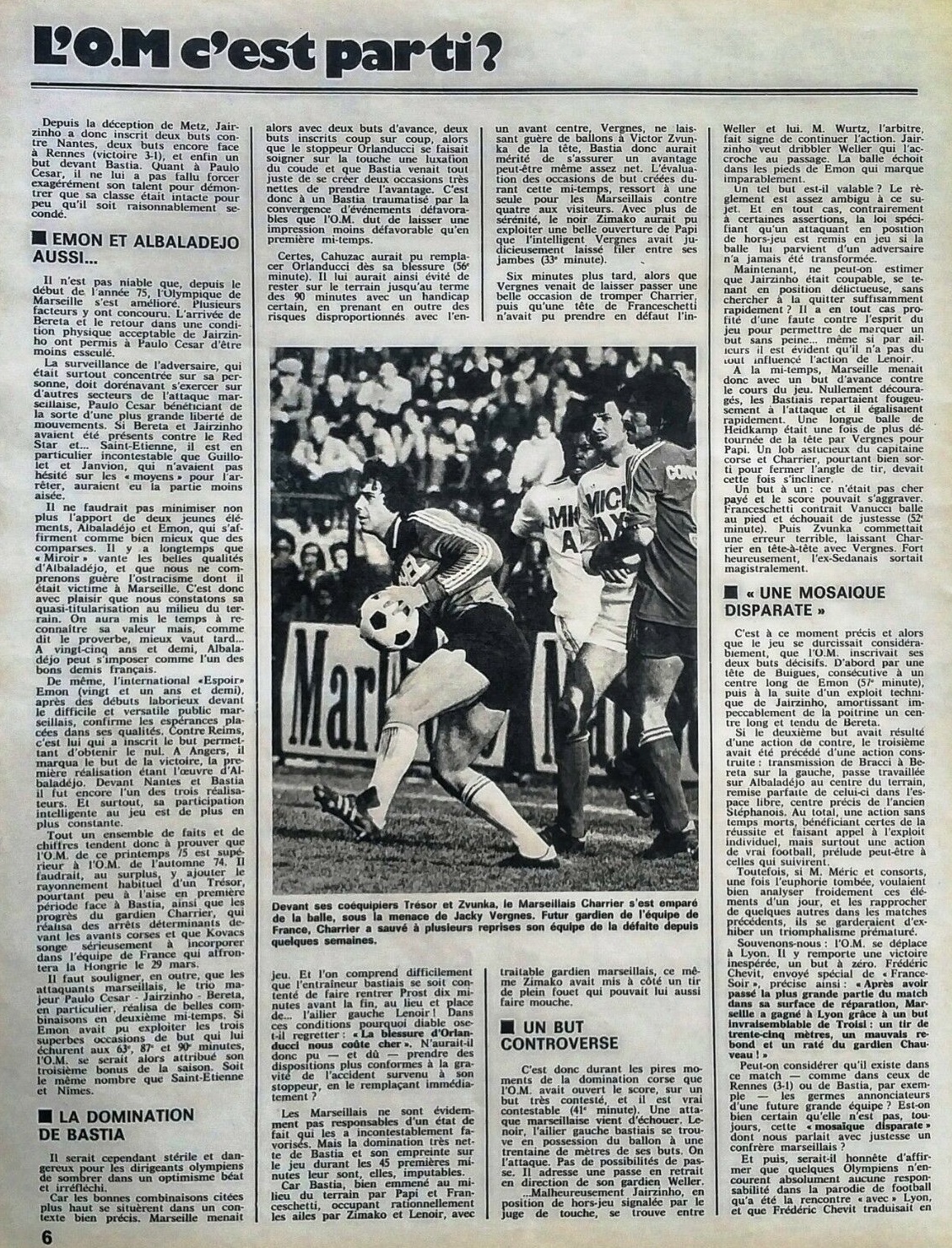 "Cela dit, n'allez surtout pas imaginer que je fais la petite bouche. L'O.M. est désormais dans le haut du tableau et sans être prétentieux, je ne crois pas que nous ayions dit notre dernier mot". JULES ZVUNKA : "NOUS AVONS SU RÉAGIR AU BON MOMENT" Pour une fois, qui n'a pas toujours était coutume on le sait, Jules Zvunka affichait un calme olympien pour livrer son sentiment. "C'est le type même du match sérieux, mais aussi difficile, nous confiait l'entraîneur. Bastia, à mon sens, a démontré cet après-midi qui n'était pas installé par hasard à la deuxième place. Les Corses nous ont posé des problèmes en première mi-temps. J'avais l'impression alors, que l'O.M. manquait de rythme, ne savait pas très bien s'organiser. Les joueurs ont su rectifier le tir après la pause est là, sans jeu de mots, nous avons vu l'étincelle jaillir. Nous enlevons donc la victoire avec l'avantage de rester sur une bonne impression. Pour le spectacle, vous ne l'ignoriez pas, il est toujours important de bien terminer un match. "Enfin, l'O.M. a obtenu aujourd'hui sa cinquième victoire consécutive. Tous ceux qui ont joué au football vous le diront comme moi, c'est une performance peu banale". Jean FERRARA |