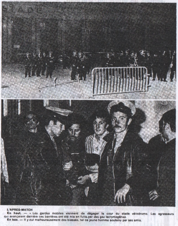 Hier soir, une fois la rencontre terminée, de violents affrontements se sont produits dans la cour du stade-vélodrome. D'un côté, les représentants de l'ordre, se protégeant derrière des casques et des boucliers, de l'autre une centaine de jeunes gens particulièrement excités, avançant comme à l'assaut derrière les barrières mobiles du stade. Les projectiles choisis étaient des bouteilles de bière, des pierres, et tous ce qui pouvaient traîner dans les environs. Devant plusieurs milliers de spectateurs, la bataille dura environ une heure. À la fin, les forces de l'ordre réussirent à prendre le dessus et à évacuer la cour du stade-vélodrome, grâce à des bombes lacrymogènes. Ainsi donc, un jour à peine après les incidents qui suivirent le match de rugby entre Narbonne et Brives, des scènes du même genre ont pu se produire Marseille. Quand donc cessera cette violence, qui n'a aucun rapport avec le sport ? Ni même avec le résultat de la partie. Le prétexte choisi par les manifestants était bien mince : une erreur de l'arbitre. Quand bien même c'est erreur lui été colossale, il faut savoir qu'un homme a le droit de se tromper, et qu'après toute une partie de football même de Coupe de France, n'est qu'un jeu. Mais il nous a semblé que les jeunes gens qui participèrent à cette bagarre le faisaient exclusivement pour s'amuser. Nous ne sommes pas même pas sûr qu'il s'agisse de véritables supporters de l'O.M. Le nouveau jeu à la mode est la bataille. On se bat dans les bals, on se bat dans les rues, et on se bat aussi au stade, pour le plaisir de se battre, pour s'amuser. |