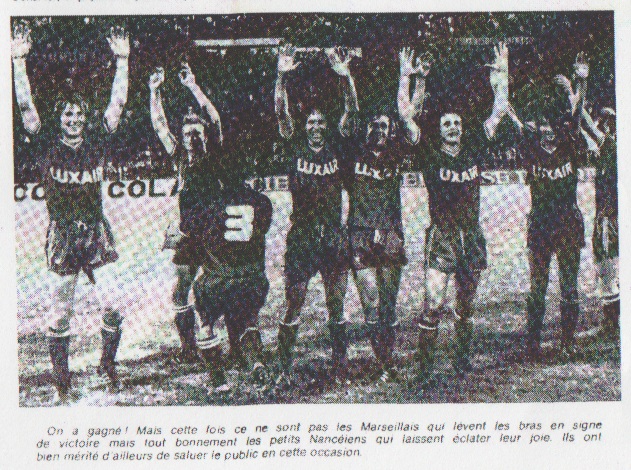 Dans le camp lorrain régnait la joie la plus complète et l'entraîneur Redin se montrait évidemment fort volubile : "Quand on est donné archi-battus on fait toujours un bon résultat. Ce match n'a pas échappé à la règle. Nous n'étions pas venus pour gagner, mais nous avons su se saisir notre occasion !" Le délégué général du club M. Cuny était radieux : "J'avais demandé à nos hommes de ne pas s'énerver, et je pensais que les Olympiens après leur victoire sur Saint-Étienne, pouvait être déconcentrés. C'est ce qui s'est produit. Les Marseillais ont piétiné en première mi-temps. Ensuite nous avons eu d'avantage d'assurance et nous avons su prendre la direction des opérations. Les Lorrains n'avaient plus peur de leurs adversaires ! J'ai été très satisfait du comportement du jeune gardien Moutier qui disputait son second match dans l'équipe, et de Platini qui affichait une grande autorité." L'ex-Marseillais Di Caro jubilait "Depuis le début de saison, nous avons toujours joué avec la frousse. Cette fois-ci c'était différent. Nous avons été délivrés !" Quant à l'autre Marseillais Donnat, il demeurait plus mesuré : "Evidemment nous sommes très contents, et notre victoire est absolument logique. Maintenant il faudra la confirmer en particulier devant Strasbourg notre futur adversaire !" Alain DELCROIX |