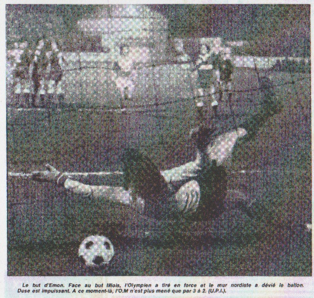 LILLE - Eh bien non ! L'O.M. n'a pu réussir hier soir à Lille son coup du "Parc des Princes", l'équipe marseillaise n'est pourtant pas passée bien loin de l'exploit. C'est même dans les toutes dernières minutes qu'elle laissa échapper le point du match nul. Un partage qui, somme toute, eut été des plus logique. Mais les remarques faites après la coupe d'Europe concernant les lacunes olympiennes sont malheureusement redevenues au premier plan de l'actualité hier soir. En somme, c'est encore un manque de réalisme qui fut, une nouvelle fois, la cause de la déception olympienne. Un réalisme qui ne concerne peut-être pas les attaquants, mais du moins la façon de défendre de l'équipe toute entière. Dommage, l'O.M., hier soir, ne méritait pas ça FLUX ET REFLUX La première mi-temps débutait à 100 à l'heure. C'est pour une fois le cas de le dire, elle n'est pas près à ce propos, d'être oubliée par les spectateurs du vieux stade Henri Jooris : 5 buts marqués plus quatre refusés. Nous n'avons pas besoin de nous étendre longuement pour signaler que le public en avait pris, comment dit pour son argent. Le match d'ailleurs avait débuté de façon curieuse en ce sens qu'il donna lieu à un complet renversement de situation. L'O.M., malgré la pression lilloise, parvenait non seulement à dominer son sujet, mais aussi à marquer un but dès la troisième minute, grâce à un coup franc de Emon, que l'arbitre seul ne vit pas pénétrer dans les filets. Ce départ était plus que satisfaisant, mais l'O.M. n'avait plus qu'à recommencer, ce qu'il fit, empressons-nous de l'ajouter avec une bonne volonté évidente, mais aussi une certaine maîtrise. Si vous voulez, personne ne s'était découragé dans les rangs marseillais. Mieux même, les Olympiens avaient, semble-t-il puisé des forces nouvelels après un coup du sort qui l'avait privé d'un point parfaitement valable, et comme en football, il y a parfois une justice, le même Emon, sur corner, cette fois, donnait à Nogues la balle du premier but que M. Bacou ne pouvait faire autrement que valider. Dès lors, les quelques supporters marseillais qui étaient assistés à quelques minutes du coup d'envoi, pouvaient envisager la suite des événements avec pas mal d'optimisme. Hélas, ce fut le moment précis où les qui marseillaise allait complètement se désunir comme elle le fit à Iena. |