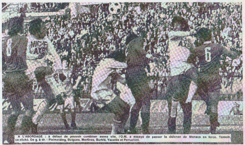 Le match traînait..., traînait dans le désordre devant des spectateurs visiblement désenchantés. L'O.M. n'arrivait pas à trouver ses marques devant la plus faible équipe de Monaco jamais vu au stade vélodrome. Il ne restait que sept minutes à jouer. On voyait déjà poindre à l'horizon le premier match nul de la saison quand enfin, se produisit l'événement attendu impatiemment par le public depuis le début du match. Sur un coup franc, tiré par Emon, le ballon fut mal dévié par le mur monégasque. Yazalde surgit et marqua, à bout portant, le but de la victoire. À quelques minutes près, le scénario était le même que celui du récent match contre Strasbourg. Le plus ennuyeux et que ce but de raccroc illustra parfaitement l'ensemble de la partie. L'O.M. méritait de gagner au bénéfice d'une domination presque constante bien que brouillonne, mais le public se retira grandement déçu. On ne devait pas entendre quand M. Hélies renvoya les deux équipes aux vestiaires le traditionnel : "On a gagné !" Sans doute cette victoire est-elle précieuse dans la mesure où elle permet à l'O.M. de rester dans le peloton lancé à la poursuite du trio de tête. Mais nous sommes à Marseille et il ne faut pas se dissimuler que les supporters olympiens attendent beaucoup mieux de leur équipe. DEUX FOIS LE POTEAU La première mi-temps aurait été désolante si elle n'avait été ponctuée par deux tirs olympiens sur le poteau. Le premier par Emon sur coup franc, le deuxième grâce à la tête de Yazalde reprenant un centre de la gauche du même Emon. Le reste ne mérite pas d'être noté, tellement les deux équipes se complurent dans l'à-peu-près, l'imprécision et le manque d'organisation tactique. Comme on le dit populairement "le ballon semblait fada". En deuxième mi-temps, le niveau du match ne s'éleva pas beaucoup et si Monaco n'a pas vous obtenu le match nul qu'il était venu chercher, il doit essentiellement à un tout petit jeu d'attaque indigne de la réputation de footballeur comme Pastorazzi, Onnis et Lechantre, qui ne furent que l'ombre d'eux même. LA VITESSE SANS PRÉCISION L'O.M. a montré à la fois son extrême bonne volonté et ses limites. Il est impossible à cette équipe de tempérament plus que de grande technique, d'accélérer la cadence du jeu sans sombrer dans l'imprécision. |