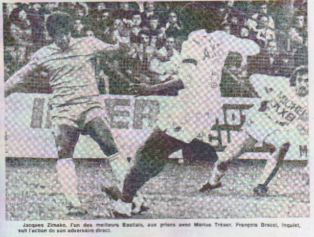 BASTIA - Il restait une poignée de secondes à jouer. Le tableau d'affichage indiquait : Bastia : 2 - O.M. : 2. Le public bastiais grondait après M. Konrath, l'arbitre du match, coupable à ses yeux d'avoir omis de sifflet deux penalties en faveur du SECB. Et nous nous apprêtions déjà rédigé notre titre : premier match nul de l'O.M. depuis le début de la saison. C'est alors que Paul Ferdinand Heidkamp, excellent rouquin allemand, subtilisait une balle chaude dans les pieds de Boubacar et s'en alla en grandes enjambées à la rencontre de son gardien de but, poursuivi par l'ailier marseillais. Que se passa-t-il alors ? Bien malin qui peut le dire. Toujours est-il que l'on vit Gili à plat ventre sur la pelouse, Heidkamp à quatre pattes sur lui et le ballon dans les pieds de Boubacar qui n'eut plus qu'à le pousser dans les buts vides. L'O.M. venait de gagner son premier match à Furiani, le 4e à l'extérieur depuis le début de la saison. Et une fois encore, comme à Nantes, comme contre Strasbourg et Monaco au stade-Vélodrome, c'est dans les toutes dernières minutes que l'équipe chère au président Meric réussissait à arracher les deux points de la victoire. LE CALME... OLYMPIEN Nous passerons sur les violents incidents qui eurent alors pour cadre les vestiaires du stade bastiais. Une poignée d'excités, toujours les mêmes, confondant tout, voulurent faire un mauvais parti, à la fois à l'arbitre et aux joueurs phocéens (Baulier reçut d'ailleurs un coup de pied à la jambe). Oublions donc cela pour revenir sur la chose, la seule qui en la circonstance nous intéresse vraiment et mérite que l'on s'y arrête, à savoir le déroulement du match. La 1re mi-temps avait été pour le moins égale. Évitant sans doute de prendre de trop gros risques, sur une pelouse légèrement glissante, les Bastiais n'abordèrent pas le match avec leur vitalité et leur enthousiasme habituels, à telle enseigne que ce furent les Olympiens qui firent circuler le ballon avec le plus d'élégance et d'efficacité. Papi, Lenoir et Franceschetti n'étant pas à l'évidence dans un bon jour, le premier nommé surtout, ce furent Buigues, Fernandez et Noguès, le plus souvent avec le concours de Boubacar, qui se mirent à tirer les ficelles avec un certain bonheur et un calme tout olympien. Malheureusement - pour l'O.M. s'entend - Yazalde et Emon ne purent concrétiser deux occasions royales, leurs autres velléités étant facilement étouffées dans l'oeuf par le remarquable libero Heidkamp. Dans le dernier quart d'heure de cette première période, Zimako, qui jusque-là s'était montré l'attaquant corse le plus incisif, allait être à l'origine du premier but de la partie. Après un impressionnant slalome d'une soixantaine de mètres, il obtenait un corner. Dzajic, au demeurant bien distrait, le tira. La défense marseillaise repoussa le ballon dans les pieds du yougoslave, qui aussitôt centra. Migeon, trompé par un rebond, ne put se saisir de la balle qui heurtant son montant droit, revint sur Papi qui donna en direction de Félix, qui, de la tête et de près, ouvrait le score. On aurait pu croire alors que les Marseillais comme à Sochaux, allaient courir vainement après ce but de retard. Il n'en fut rien. |