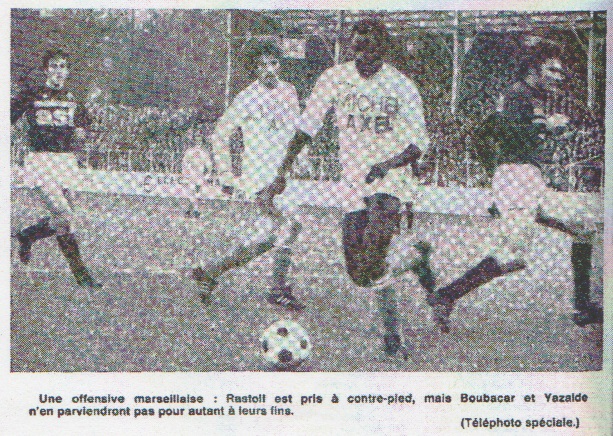 BETTA : UNE RÉCOMPENSE LOGIQUE La deuxième mi-temps fut nettement messine. Dans l'équipe de l'O.M., Noguès et Boubacar s'épuisaient dans les courses folles surtout les points du terrain. S'il y avait un prix de la course à pied et du dénouement, il faudrait le leur accorder. Mais comme, exception faite de Trésor et de Victor Zvunka, tout le monde baissait de pied, il faut bien reconnaître que si l'activité, mais dispersé et brouillonne, était indispensable il était cependant juste que le but de la victoire revint dans une proportion importante à Betta, meilleur footballeur sur le terrain. Un centre très tendu de sa part, à la suite d'une percée sur la gauche, et une tête de Curioni... la cause était entendue. Par la suite, Migeon, jusque-là encore très peu menacé, devait se mettre en vedette en exécutant quelques arrêts et interceptions de classe. Sans lui, l'addition eut été vraiment plus lourde. LE CENTRE DE LA DÉFENSE ET BERETA On ajoutera que la rencontre fut de bonne qualité, et même passionnante en deuxième mi-temps. L'O.M. a été battu par une équipe qui, au grand complet, semble avoir les moyens de terminer le championnat tout en haut du tableau. On peut donc déduire assez aisément de cette rencontre que l'O.M. aura du mal, cette saison, à obtenir une place qualificative pour la Coupe de l'U.E.F.A. Ce n'est pas impossible, mais il vaut mieux encore ne pas trop y croire. Dans l'équipe olympienne, le point fort a été la défense, faite de Trésor et de Victor Zvunka. Ces deux hommes, en conjuguant leurs actions athlétiques, interdirent pratiquement durant tout le match l'approche de leur but aux attaquants messins. Nous avons déjà noté la bonne rentrée de Bereta. Il se mit en évidence en deuxième mi-temps, mais en première, il avait prouvé qu'il était redevenu indispensable à l'équipe. Dans l'équipe de Metz, dont le jeu collectif serait à citer en exemple, le meilleur footballeur fut Betta. Avec lui, nous citerons le jeune Zenier, d'une remarquable finesse, l'avant-centre Curioni, qui a le grand mérite d'être toujours là, Jeitz, Rey, le grand gardien, très sûr, et également le jeune arrière Battiston qui semble être un très grand espoir du football français. Maurice FABREGUETTES |