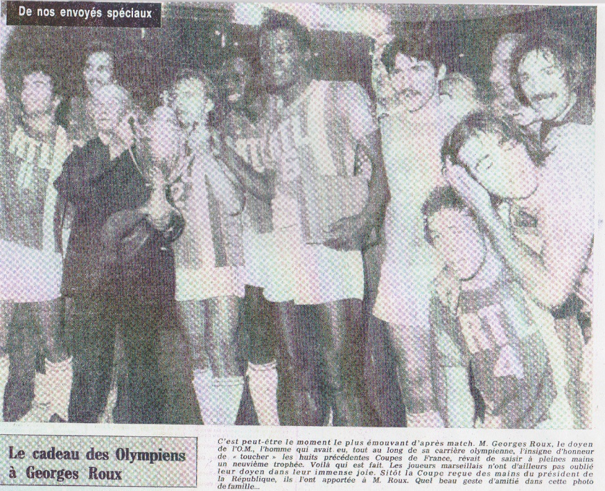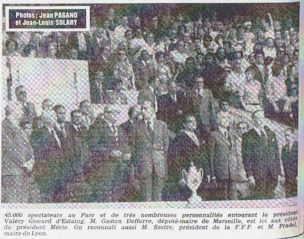 Je suis heureux que l'Olympique de Marseille, après quatre ans, ait renoué avec le succès, nous a dit le député-maire de Marseille. Pour moi, sa victoire est amplement justifiée par le nombre des occasions de buts que l'O.M. a su se créer et pour ma part j'en ai relevé au moins quatre. "Nos représentants ont été gênés pendant un bon quart d'heure par la vivacité de leurs adversaires, mais ils ont su se ressaisir pour prendre progressivement la direction de la partie. "La rencontre m'a beaucoup plu, bien qu'elle ait été jouée de façon assez rude. "Les Lyonnais étaient plus rapides, les Marseillais plus expérimentés, plus scientifique et surtout plus efficaces. C'est l'efficacité qui a prévalu. Je ne crois pas que la victoire de l'O.M. puisse être contestée !" |