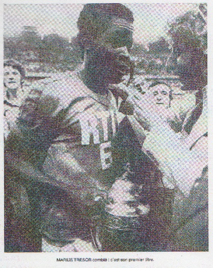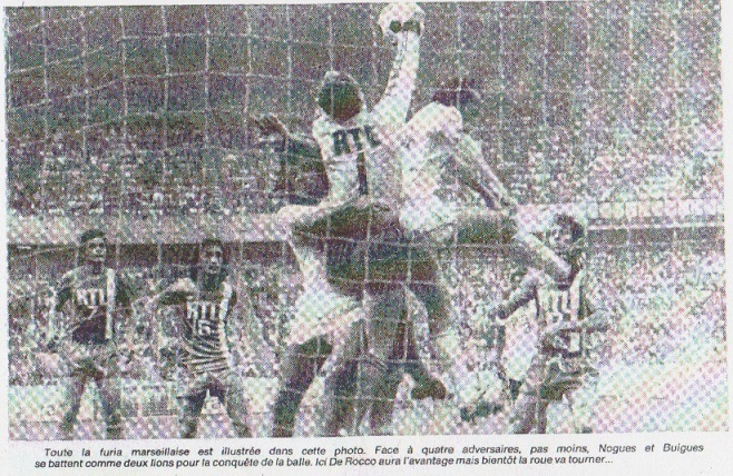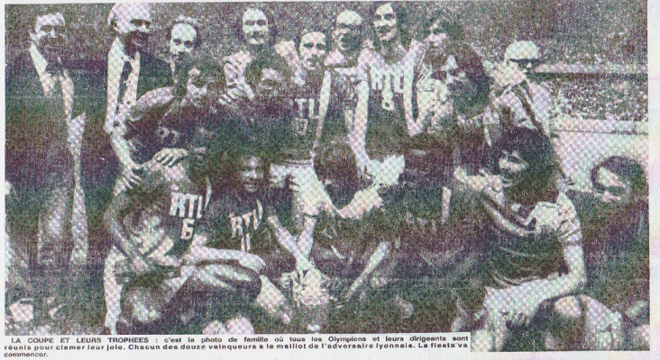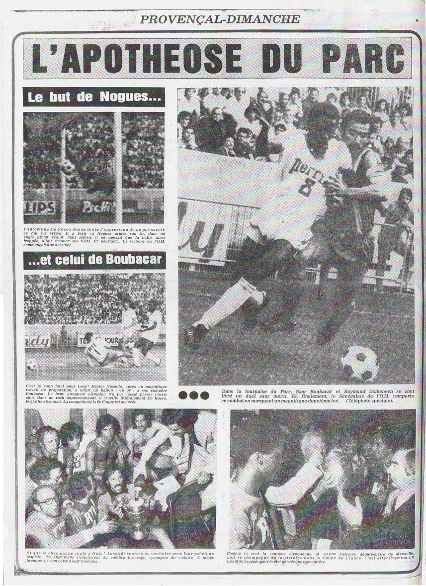 Vraiment je crois rêver. Toujours stagiaire et vainqueur de la Coupe". Une gorgée de champagne à même le trophée, et Jeannot devait conclure : "Maintenant, sur la lancée, il me faut une médaille d'Or aux Jeux Olympiques". Le kilo perdu, nous sommes tombés dans les bras de Victor Zvunka, qui fut sans doute un des meilleurs hommes sur le terrain, sinon le meilleur. "À 0-0, tout était possible, devait-il préciser, mais lorsque Raoul a marqué le premier but, alors j'ai su que nous ne pouvions plus perdre, qu'il était impossible que les attaquants Lyonnais passent ; j'aurais préféré mourir sur la pelouse du Parc des Princes". Georges Bereta, le vieil habitué de la Coupe de France, puisqu'il venait de gagner sa quatrième, se contenter de commentaires techniques : "Je pense que nous avons bien joué le jeu et je savais que l'équipe qui réussirait à marquer la première avait de fortes chances de ne pas être rejointe au score. Personnellement j'ai compris que nous étions sur le bon chemin en fin de première mi-temps. D'avord parce que j'ai réussi quelques centres qui ont donné le frisson à défense lyonnaise, ensuite parce que je me suis rendu compte que Trésor décourageait littéralement Chiesa et Lacombe en venant à tous coups leur souffler la balle". Nous avions perdu notre troisième kilo, lorsque nous sommes tombés sur Boubacar véritablement hilare : "C'est fantastique, c'est extraordinaire, je n'en reviens encore pas. J'ai marqué un but et je vous avoue que si Domenech ne m'avait pas abattu dans la surface de réparation, je me sentais capable d'en marquer un second. Mais que de belles choses, j'aurais à raconter chez moi au Sénégal". Le grand "Tchoi" avait conscience de n'avoir pas fourni un grand match : "Je suis tombé sur un Chiesa terriblement motivé et très remuant qui est difficile à marquer. Je crois, toutefois, d'avoir mieux terminé que ce que j'avais débuté et la victoire et d'une récompense logique". Quant au jeune Martinez, il ouvrait de grands yeux et véritablement ne semblait pas comprendre, se contentant de répondre oui à toutes nos questions mêmes les plus curieuses. N'oublions pas de donner le point de vue de l'entraîneur, Jules Zvunka. Nu comme un ver, sous la douche, il commentait : "J'étais confiant, avant le match. J'étais confiant pendant le match. Le résultat prouve que j'avais raison. Certes, je ne vous dirai pas qu'à 0 à 0, je chantonnais sur mon banc de touche, et je n'avais pas le sentiment que nous pourrions perdre. Quelle belle récompense pour moi et pour mes joueurs". Enfin, Migeon, le boute en train de l'équipe expliquait : "Je n'ai jamais véritablement tremblé. La seule action véritablement dangereuse de Lyon est située à la 85e minute, lorsque j'ai contré du pied un tir de Ferrigno. Mais, à ce moment-là, les carottes étaient déjà cuites. Nous avions la Coupe dans la poche". Et, Migeon de pousser un triple "hip hip hip hourra !" repris par tous ses camarades. André de ROCCA |