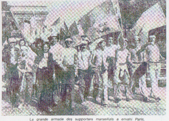 Des pétards explosent tous azimuts, nappant les quais de Perrache de déchets de carton multicolores. Des cris fusent à l'adresse des autochtones, plus ou moins drôle, plus ou moins polis. Il est vrai que la moyenne d'âge supportrice est très jeune. Quelque peu affolée, la préposée au micro, après avoir lancé des appels au calme, annonce que le train va partir, que le train part... Mais rien ne bouge. Et pour cause : le mécanicien a disparu. Après force appels on le retrouve enfin. Jusqu'à Paris, le voyage sera désormais sans histoire. Seuls quelques rugissements sont à enregistrer, qui répondent à d'impertinents ou ironiques "Allez Lyon" ou "Allez les verts". SAMEDI 9 HEURES, GARDE DE LYON. Heureuse surprise dans laquelle certains voient un présage : un soleil resplendissant et une température méditerranéenne nous attendait dans la capitale. C'est l'heure du petit déjeuner pris dans les nombreux établissements jouxtant la gare de Lyon. Un accueil bon enfant est réservé à cette horde turbulente. Pour ceux que le café noir n'aurait pas suffisamment réveillés, les sonneurs de clairon sont là... Dans la cohue d'un départ précipité, j'égarerai là mon portefeuille renfermant tout mon argent et mes papiers. Ce qui me vaudra d'effectuer quelques heures plus tard en compagnie d'André de Rocca, une folle course en métro à travers Paris, équipée couronnée de succès par la grâce de l'ange gardien des journalistes. Nos supporters, eux, vont entreprendre de conquérir la capitale, après avoir longuement fait résonner les voûtes du métro qui en ont vu d'autres... Sur les grands boulevards, sur les Champs-Élysées, des défilés sont organisés. Et pour qui a connu l'invraisemblable fourmillement en 1968, il ne s'agit là que de manifestations dérisoires. Ce n'est qu'en fin d'après-midi, les jonctions s'étant opérées, que l'on mesure vraiment que les Marseillais se sont déplacés en force. Quant aux Lyonnais ils demeurent longtemps invisibles, exception faite de quelques groupuscules rencontrés au cours de nos pérégrinations. Incontestablement cette finale n'aura pas été celle du délire des masses. Et c'est aussi bien comme cela, le supporter ayant trop souvent tendance à oublier que son rôle ne doit jamais s'échapper des limites du stade. 18 h. 30 LE PARC : AU PIED DU MUR... Cette fois, le compte à rebours est lancé. Tout au long des vingt stations de métro qui nous séparent de la Porte de Saint-Cloud, point de ralliement général, des renforts nous arrivent, dans un concert de klaxons et de crécelle. À peine revenus à l'air libre, sous l'imposante bâtisse du parc, nous sommes pris dans la foule d'autant plus dense qu'un service d'ordre intransigeant, fouillant sacs et porte-documents, fait un double barrage devant les grilles. Les marchands de fanions et des casquettes continuent à faire des affaires d'or. Nombre d'entre eux d'ailleurs, vendent tout à la fois des drapeaux lyonnais et marseillais, criant à la cantonade, pour ne vexer personne "Allez les deux !" Les gradins, aux trois quarts vides à 18 heures vont de garnir très vite. Et dans la travée est, entièrement marseillaise, la victoire des minimes de l'O.M. comme celle des cadets du Sud-Est, annoncées au micro, sont saluées à l'Italienne par un déploiement de bannières. Désormais, tout est en place. La grande fête peut commencer. Alain PECHERAL |
