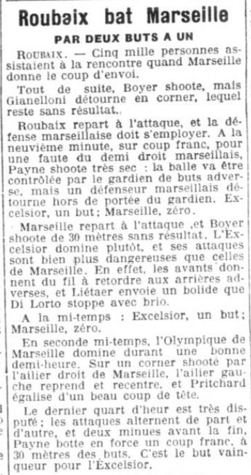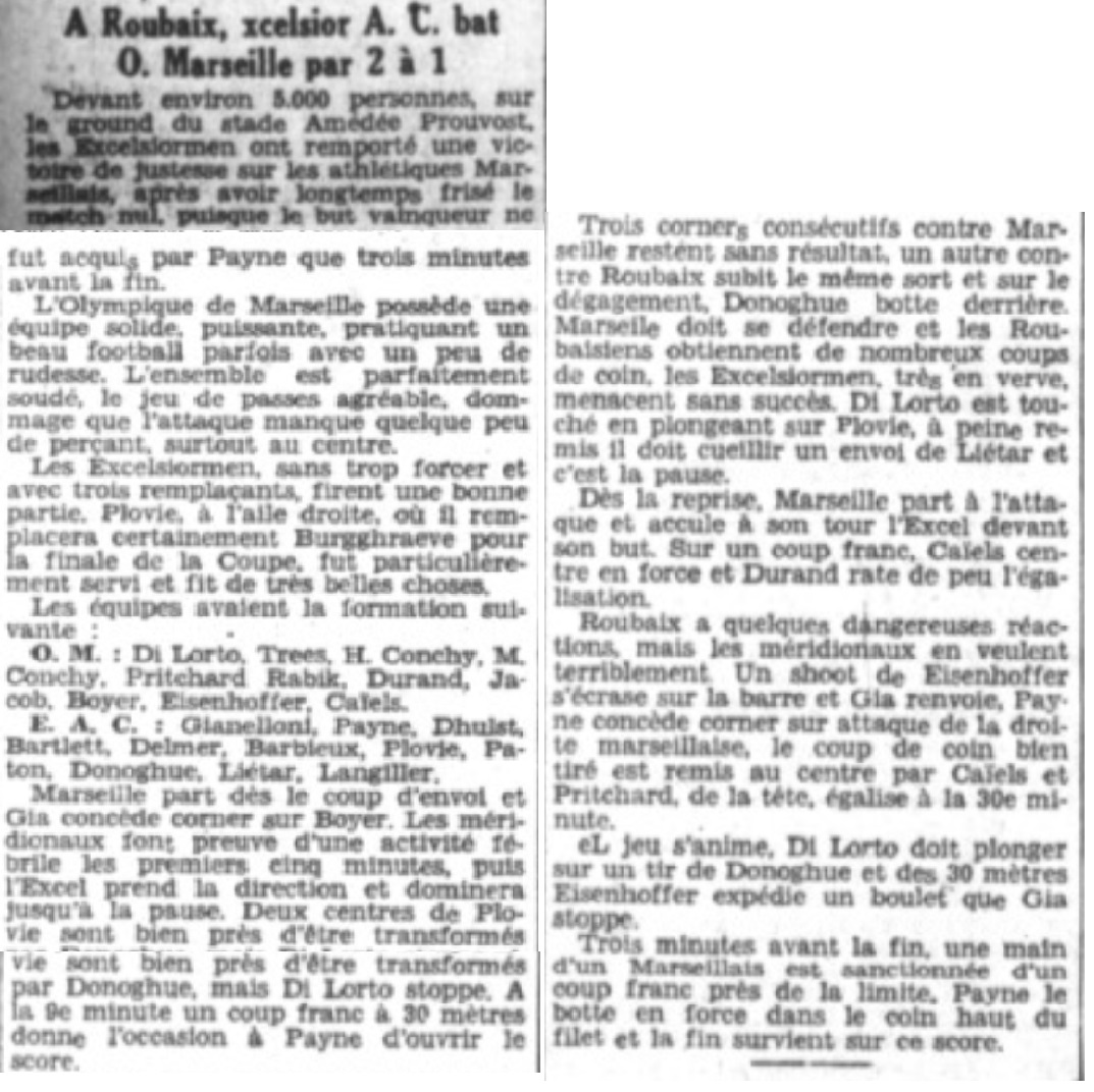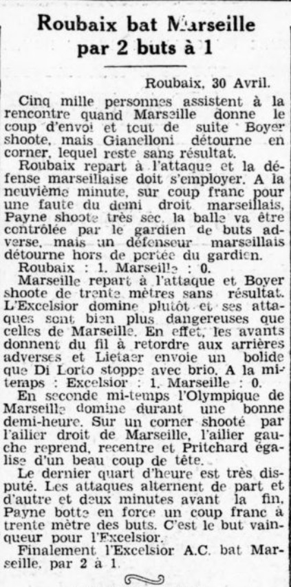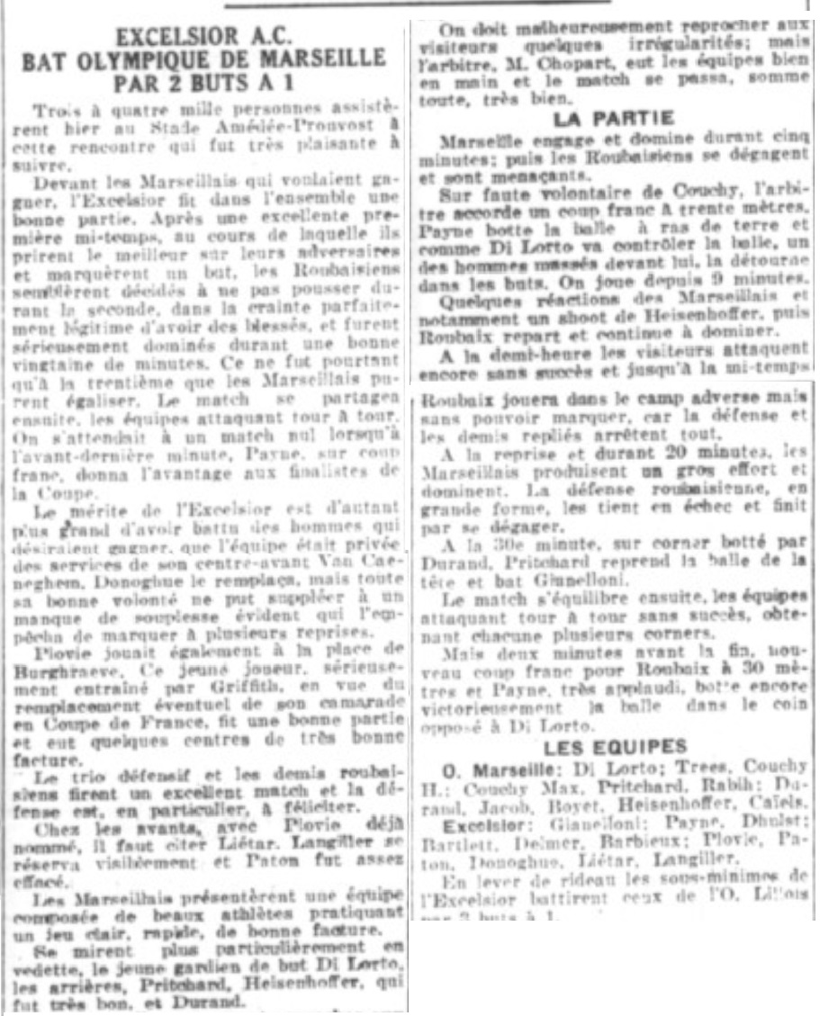 On croit à la victoire marseillaise, car les avants se décident à combiner mais au contraire sur ouverture de Delmer, Conchy bousculera légèrement Patmon. L'arbitre sifflera un coup franc sévère. Ce coup franc tiré avec brio par Paynes, ne laisse aucune chance à Di Lorto, surtout que les défenseurs n'ont pas su bien se placer. L'O.M. part à l'attaque d'un point Jacob qui joue demi lancera Durand, ce dernier attire à lui et réussit une place magnifique sur Boyer. Boyer fonce, l'on sent lançant le but... Mais l'arbitre arrête le match en sifflant la fin de la rencontre qui se joua correctement. Les finalistes tout en jouant par moments avec brio, parurent un peu nerveux. Sans doute l'attente du grand choc. Langiller a excusé de s'être réservé et en ne peut l'en blâmer. La ligne d'avants paraît marquer de réalisateurs. Espérant que dimanche ils sauront défendre de tout leur coeur l'intérêt du si critiqué professionnalisme. Les demis sont très accrocheurs. Delmer raccrochent un peu de façon incorrecte. Des arrières, Paynes paraît le plus avisé. Gianelloni manqua de confiance. A l'O.M., Di Lorto sortit une belle partie : il ne fut battu que sur des coups francs. Trees produisit une très belle impression. Décidé, solide, il prit nettement le dessus sur Langiller et ses coups de bottes soulagérent l'équipe. Conchy fut honnête, adroit de volée, ses déplacements manquent un peu de précision. Rabih fut aguicheur, ses services ne furent pas toujours heureux. Pritchard s'avera meilleur en seconde mi-temps, C'est un demi-centre de grande valeur qui est toutefois monocordes, car il sert plus volontiers les poches ; Max Conchy fut aguicheu. Il eut le tort de chercher des querelles, ce n'était pas très utile puisque le match ne changeait rien au résultat. Caiels a le tort de shooter continuellement au but ; à deux reprises, s'il avait passé on aurait enregistré sans doute deux but pour l'Olympique ; ses moyens sont indéniables, quel dommage de ne pas les utiliser pour le bien de l'équipe. Eisenffoher se chercha qu'à faire passer à Caiels. Il oublia totalement le centre avant. Avec un esprit pareil, il faut ne pas attendre de grandes promesses de l'équipe. Boyer joua trop en isolé. Il paraît rétabli on le sèvre un peu trop de la balle. Jacob fit une partie irritante ; son manque d'habitude de grandes rencontres est évident. Durand a été oublié, sur les quelques balles qu'il eut, il fit de très belles et de vilaines choses.