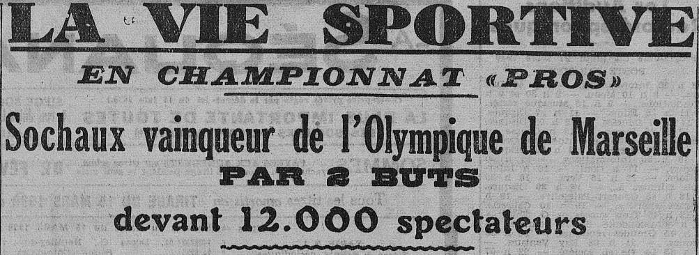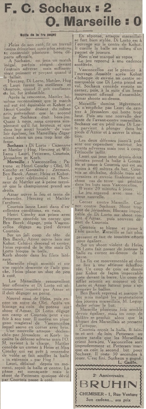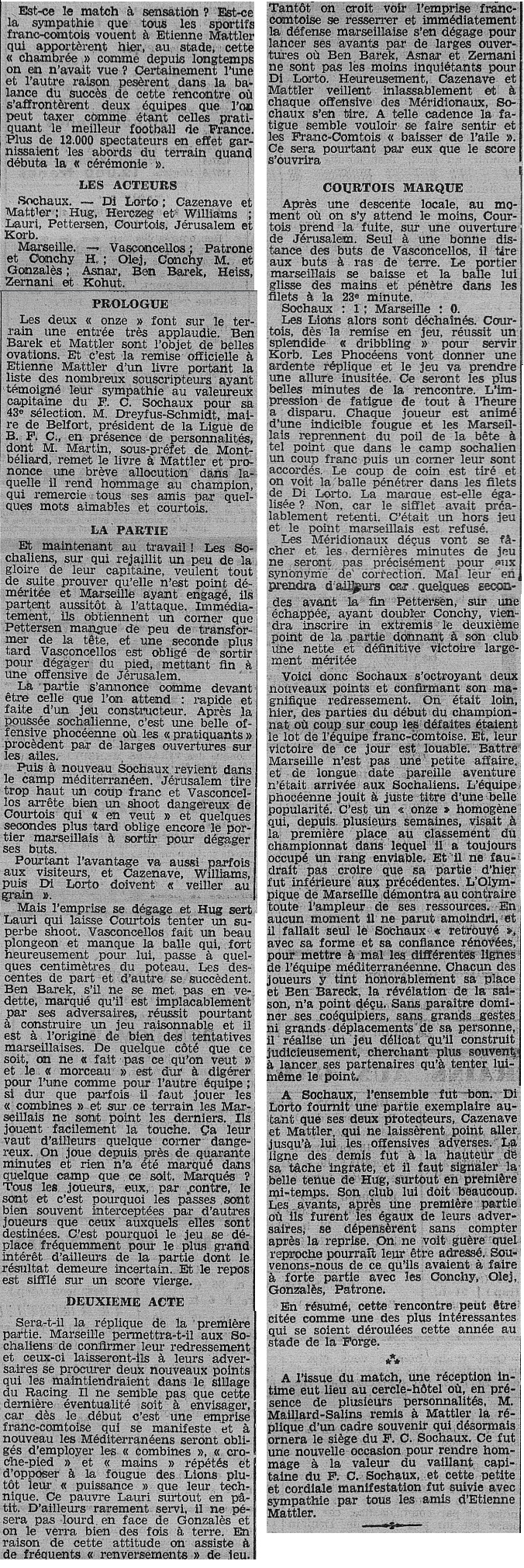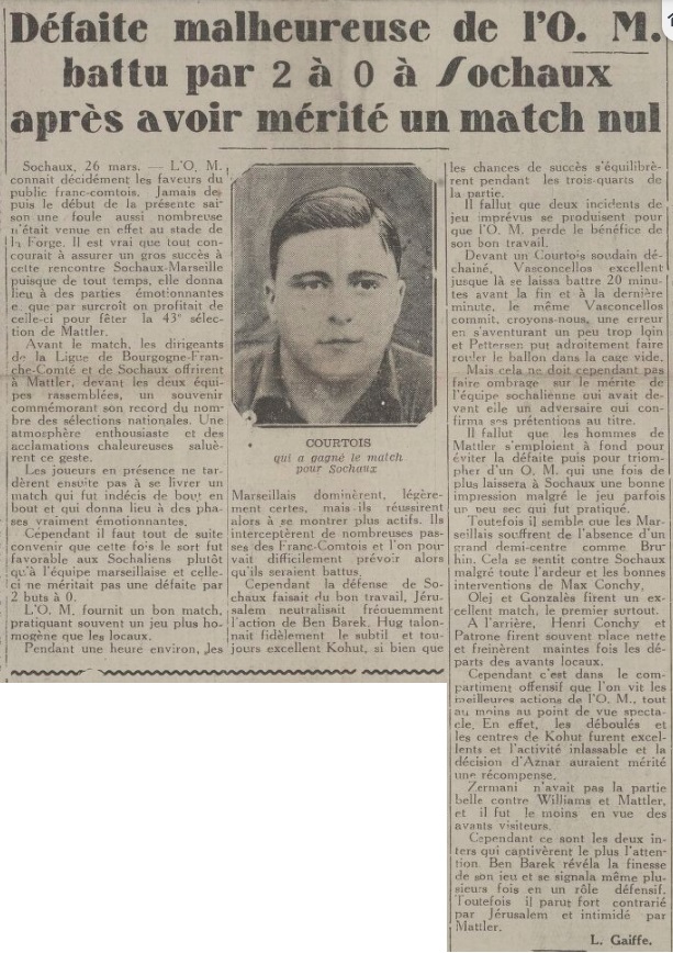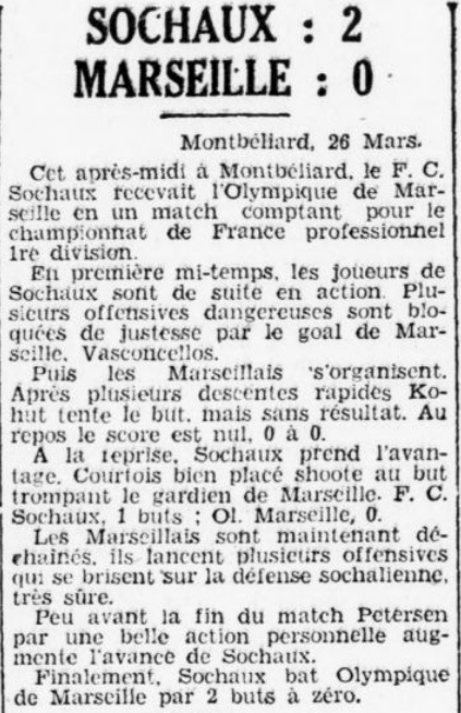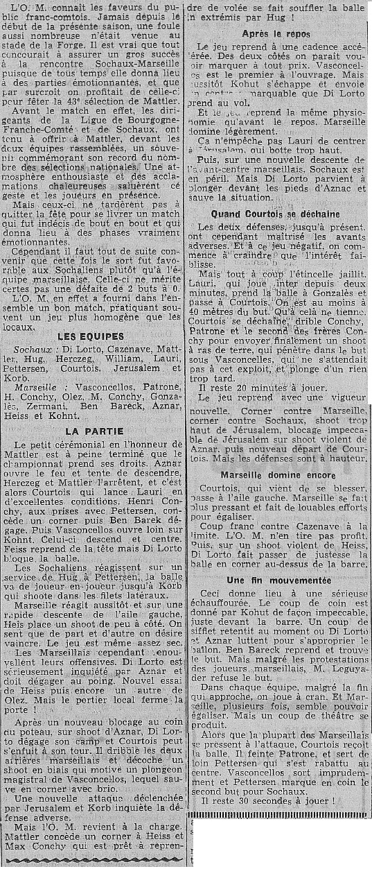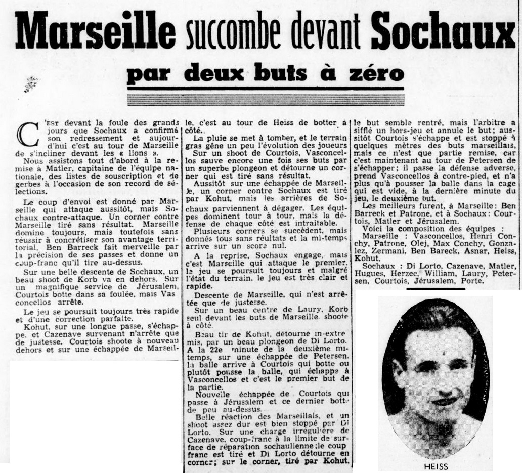 Les visiteurs qui veulent essayer d'obtenir le match nul passent à l'attaque, mais les locaux résistent bien et ils viennent même souvent jouer dans le camps marseillais et Conchy doit dégager in extremis devant Courtois. Il ne reste plus que cinq minutes, l'arbitre accorde un coup franc à Marseille à la limite de la surface de réparation ; Kohut le tire, mais Sochaux dégage faiblement et Di Lorto doit concéder un corner. Celui-ci est très bien tiré, mais il y a hors jeu et c'est dommage, car peu après le coup de sifflet la balle pénètre dans les filets. Courtois part seul depuis le centre du terrain ; il passe trois adversaires et il est arrêté au dernier moement par Henry Conchy. La fin est palpitante, car Sochaux ne veut pas de laisser remonter et mieux même ; une belle ouverture de Courtois donne la balle à Petersen qui descend seul, passe Conchy trop avancé et n'a aucun peine à battre Vasconcellos qui s'est avancé en vain. Sochaux, deux buts ; Marseille, zéro. Il reste trente secondes à jouer et sitôt la balle remise en jeu, l'arbitre siffle la fin de ce joli match qui fut souvent palpitant. Considération Ce match a été très plaisant et avant toute chose il y a lieu de féliciter les deux équipes pour la belle partie à laquelle elles nous ont fait assister. Les spectateurs tenus en haleine d'un bout à l'autre du match ont tous été pleinement satisfaits de la belle exhibition fournie par les deux équipes. Vainqueurs et vaincus ont fait preuve d'un cran, d'un allant et d'une volonté à toute épreuve. D'un bout à l'autre, le débat a été plaisant et fertile en émotions. Pendant plus d'une heure, l'incertitude a plané et même après le but marqué par Courtois, cette incertitude demeurait toujours car chacun se demandait si Sochaux pourrait conserver son avance. Mais chacun aussi avait l'impression, à ce moment, que Marseille ne pouvait espérer qu'un match nul. Les Sochaliens sous l'impulsion de leur capitaine qui se démenait comme un beau diable firent mieux que de conserver, leur maigre avance puisque Petersen, grâce à Courtois et au fait que les deux arrières meilleures parties de la saison, ils jouèrent le plus souvent à une allure endiablée et sur la fin, malgré leur petite avance ils ne ralentirent pas leur action et purent endiguer les assauts des joyeux phocéens qui se ruaient vers les buts adverses avec un cran magnifique. Encore une fois, les 22 joueurs nous firent assister à un match mémorable. A Sochaux, il y a lieu de citer la défense qui a été impeccable avec Di Lorto, Mattler et Cazenave. Etienne est toujours en pleine forme, à l'heure actuelle il est meilleur que jamais et il pourrait bien améliorer son record de la sélection nationale. Herczeg a joué avec coeur ; William et Hug furent courageux, aucune épreuve ne les rebute, mais nous devons signaler que la ligne de demis sochalienne n'a pas la classe des autres lignes de l'équipe. A l'avant, Courtois a été extraordinaire marseillais s'étaient trop avancés pouvait encore agraver le score. Il n'y a pas à tenir rigueur ni à Henry Conchy ni à Patrone, qui furent excellents de s'être un peu avancé, puisque le temps passait et que toute l'équipe visiteuse ne devait avoir qu'un but essayer d'égaliser. Dans l'ensemble, la victoire de Sochaux est méritée. Mais le score de 1 à 0 aurait été plus équitable et même un match nul n'aurait pas été tellement illogique. Marseille a dominé légèrement en première mi-temps mais au cours de la seconde Sochaux a été plus dangereux. En tous cas, Sochaux a su vouloir et nous avions rarement vu les "Lions" opérer avec un tel cran et un tel dynamisme. Sochaux qui jouait à ras de terre a surtout essayé de passer par le centre, tandis que l'O.M. pratiquait un jeu de volée et souvent fait de longues passes en profondeur sur son centre avant et ses ailiers. Le Sochaliens fournirent une de leurs de brio, il est en pleine forme. Jérusalem a fournit un bon match ; Lauri est toujours excellent ; Petersen assez irrégulier et Korb n'a pas fait sa parti habituelle. A Marseille, l'équipe est plus complète et plus homogène. Vasconcellos n'a pas paru à l'aise sur les balles à ras de terre et il semble qu'il aurait pu arrêter le premier but. Patrone a fourni un bon match et Henri Conchy a été excellent. Il semble qu'au centre du terrain, Courtois n'était parfois pas assez marqué et notre avant centre national en a profité pour se distinguer ou pour passer judicieusement à ses partenaires. Max Conchy, demi-centre, a fait tout son devoir ; Olej montra une tendance à jouer durement. En attaque, Ben Barek montra ses grandes qualités ; Kohut a été un danger constant pour ses adversaires ; Zermani a fait de bonnes choses ; Aznar s'est signalé en maintes occasions et Heiss a été un travailleur infatigable. Jean CHARRIERE |