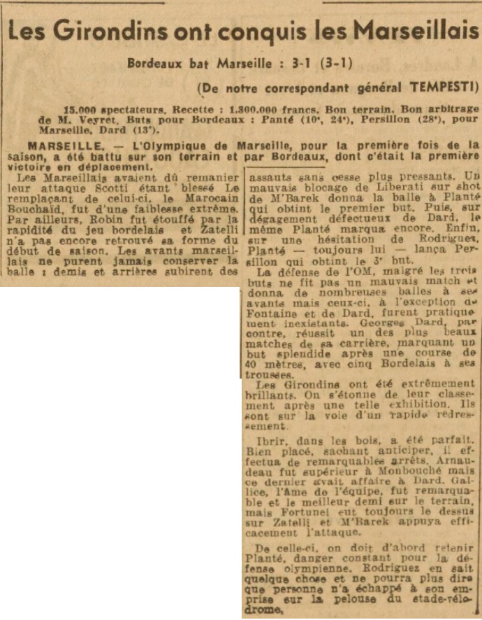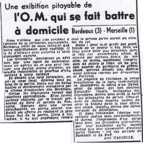 Le score à l'origine était de 3-1 en faveur de Bordeaux, les buteurs étaient Georges Dard (13') pour l'OM, Roger Plante (10' et 24') et René Persillon (28') pour Bordeaux. Mais l'OM formulera des réserves sur la qualification du gardien de but Bordelais Abderrahmane Ibrir, Marseille obtient le gain du match sur le score de 0-0 par décision en date du 02/02/1947. |