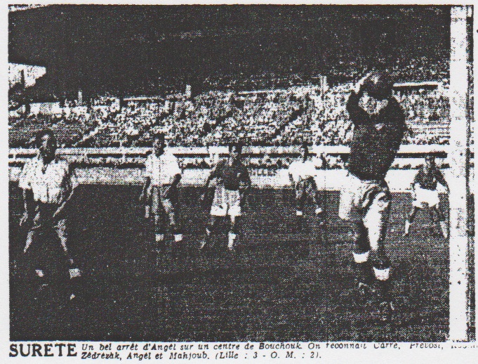 Dès le début, l'O.M. qui imprime au jeu une allure accélérée attaque. Lille doit se défendre. Sa défense, quelque peu bousculée, s'affole. Bouchouk souvent lancé, se met immédiatement en évidence et Mahjoub se signale par ses trouées au centre. Pourtant, Angel joue avec beaucoup d'autorité dans ses 18 mètres et s'en tire, somme toute, avec bonheur. Cependant, il ne pourra empêcher, à la 11e minute, Dard de réussir le but sur action de Mahjoub, mais Dard était hors-jeu et ce point ne compte pas. Ce n'est que partie remise. Trois minutes après, Pujalte descend et sur la ligne des 6 mètres, centre. La balle parvient à Robin démarqué qui ne laisse aucune chance à Angel. Le jeu se stabilise alors. Baratte réussit lui aussi à battre Liberati, mais il était hors-jeu et ce but ne compte pas non plus. La lutte est toujours vive, mais le jeu est quelque peu décousu. Mahjoub échappe à nouveau à Prévost, mais il trouve encore Angel à la parade. Lille contre-attaque à chaque occasion et Liberati doit notamment intervenir avec décision sur une action Baratte-Strappe fort dangereuse. À la 35e minute, Bouchouk lancé par Robin, adresse un centre shoot vers Angel. Celui-ci stoppe sans bloquer, la balle lui échappe des mains, mais il la rattrape aussitôt. L'arbitre de touche bien placé montre le centre du terrain. Après consultation M. Fauquenberghe accorde le but. Lille tente alors un effort, mais le jeu est partagé et les deux gardiens de buts doivent intervenir à tour de rôle. À la mi-temps, l'O.M. mène très justement par 2 buts à 0. |