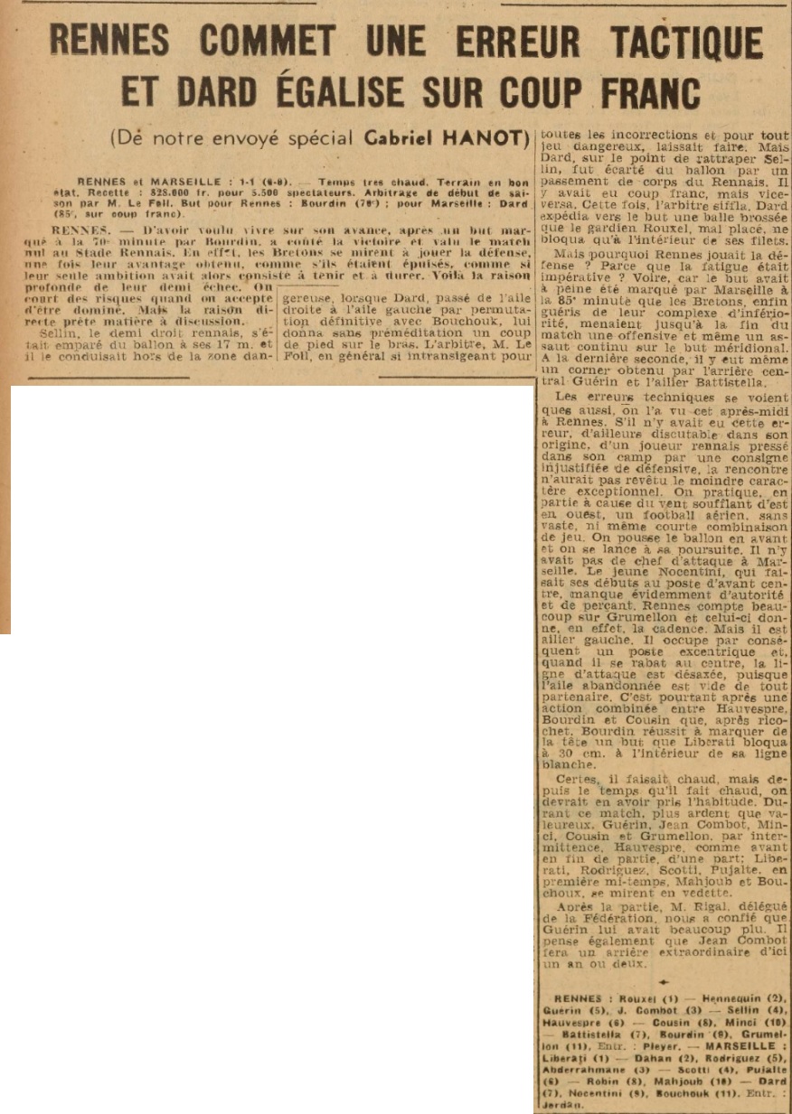 Un superbe tir de Rodriguez sort de peu. Sur coup franc tiré par Cousin, un cafouillage se produit sur les buts de Liberati qui s'en tire sans dommage. Bourdin ouvre le score Corner contre Rennes qui faiblit. Mais les avants de pointe de Marseille ne shootent pas. Cousin et Grumellon reviennent à la charge. La défense méridionale s'affole et Bourdin en profite pour marquer, malgré Liberati, qui stoppe à l'intérieur de ses bois. Rennes paraît alors avoir la victoire en mains. Mais les Bretons commettent l'erreur de jouer la défense au lieu de chercher à augmenter leur avance. Dard égalise Marseille en profite et, sur coup franc sévère contre Sellin, Dard obtient l'égalisation, grâce à la complicité de Rouxel, mal placé. Les Bretons se réveillent alors, mais trop tard. La fin est sifflée sur le score nul de 1 à 1, alors que Battistella s'apprêtait à shooter un nouveau corner, concédé par Liberati. Si Rennes a plus d'occasions de marquer que son adversaire, il ne méritait cependant pas mieux que le match nul, en raison de la grosse faute de tactique qui suivit le but de Bourdin. À Marseille, bonne tenue de Liberati, Rodriguez, Scotti, Pujalte, Bouchouk et Mahjoub. À Rennes : Guérin, Jean Combot, Manci, Grumellon et Cousin sont à signaler. André TROPRES |