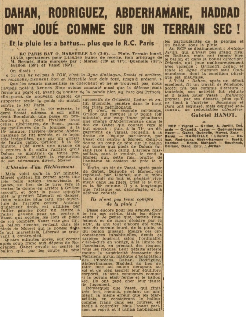 PARIS - Le résultat du match Racing - Marseille a pu surprendre ceux qui n'ont pas assisté à la rencontre. Le score est sans doute un peu sévère pour les Marseillais, encore que ces derniers aient été vraiment décevants. La partie se déroula sous un ciel gris et orageux et la pluie qui ne cessa de tomber rendit la balle très glissante. Cependant on assista dès le début à de rapides déplacements de jeu. L'Olympique attaque et Robin place un shoot que Vignal arrête. Moreel, très actif, descend en vitesse, centre et profitant d'un mauvais arrêt de Dahan, il marque à la 33e le premier but pour le Racing. Quelques minutes après c'est Quenolle qui, d'une très jolie tête, expédie la balle dans les filets de Liberati. Mi-temps : Racing, 2 ; Olympique, 0. Malgré de vives réactions des marseillais où le petit ailier Bouchouk se distingue, l'emprise parisienne va encore s'affirmer à la deuxième mi-temps, et sur coup franc, Grillon marque le troisième but le tir plongeant ayant trompé Liberati. Bouchouk file le long de la touche et expédie un tir très sec que Vignal détourne en corner. Encore une descente de Moreel qui profit d'un cafouillage pour ajouter un quatrième but au score. Il ne reste plus que cinq minutes à jouer, Waast, bien placé, prend son temps et envoie un boulet imparable dans le coin gauche des buts marseillais. La fin et siffler peu après. Racing, 5 : Marseille, 0. Considérations Mauvaise partie des Marseillais où l'attaque fut quasi-inexistante. Exception faite pour Bouchouk, actif et volontaire, l'équipe joua sans aucune cohésion. Liberati très malheureux dans ses interventions. Ensemble décevant et l'on comprend les gestes de désespoir de Jordan qui se lamentait sur la touche. Pourtant le Racing n'était pas dans un de ses meilleurs jours et les inters Gundmudsson et Waast, très lents, freinèrent souvent l'action de leurs avants de pointe, Moreel, toujours très dangereux dans ses intentions. Les anciens Leduc et Grizetti, toujours solide au poste, Juvilly sans faire oublier Lamy fit de jolies choses. Vignal fit bien le peu qu'il eut à faire. Delgado reçu un avertissement de l'arbitre. Il aurait mérité davantage car il se signala par plusieurs charges irrégulières et très dangereuses pour adversaire. |