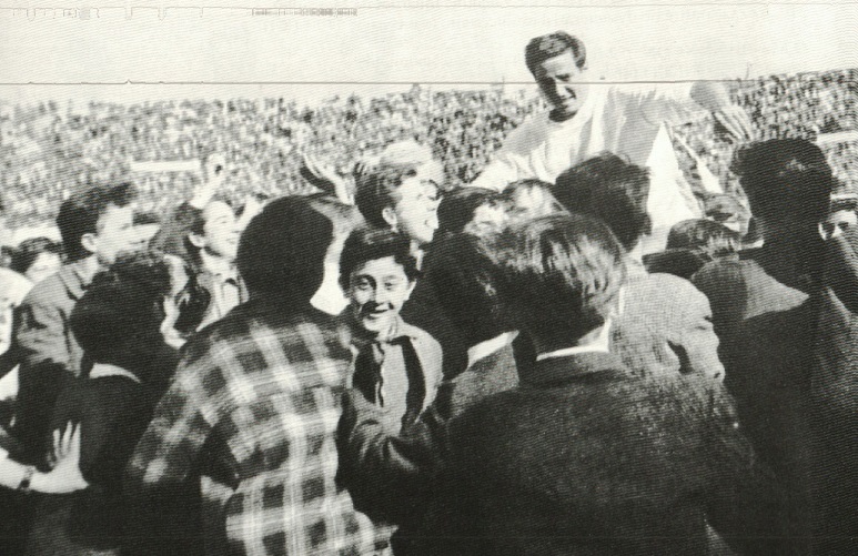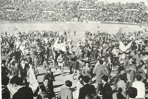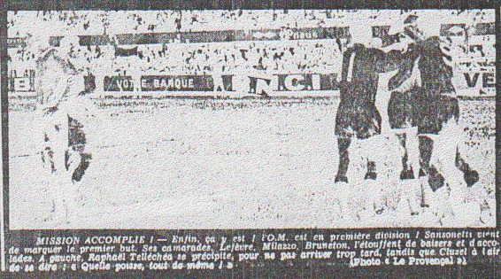 Premier but de Sansonetti La première attaque fut la bonne... Tellechea donna en profondeur à Sansonetti qui poussa la balle dans la case devançant la sortie de Cluzel (47me). Explosion de joie générale, quelque peu tempérée par une excellente volée de Cassar qui frôla le montant (48me). Ce ne devait être qu'une timide velléité et l'O.M. repris l'affaire en main. A la 52me minute Sanso reprenait de volée, légèrement au-dessus, un centre aérien de Lefevre... Sansonnetti confirme Il allait libérer toute l'assistance de son angoisse... relative dans des circonstances quelque peu heureuses... Une ouverture un peu trop longue Tellechea fut ratée par Cluzel... et cela remise en jeu Étienne Sansonetti qui, en pleine euphorie, réussit à redresser la balle selon un angle impossible et à l'envoyer dans la cage (73me). Cela mettait fin à toute discussion et provoquait une nouvelle flambée d'enthousiasme qui n'allait pas se démentir jusqu'à la fin. Au cours de ce dernier quart d'heure Sansonetti faillit marquer encore deux fois, à la suite d'un échange avec Milazzo, puis sur une percée solitaire échoua sur Cluzel (78me et 82me). Les dernières minutes virent une foule juvénile déchaînée danser une véritable sarabande autour... mais aussi parfois sur la pelouse, ce qui provoqua l'ire du service d'ordre, de l'arbitre M. Lamour.. et bien entendu des bisontins. Certes, on n'avait encore jamais vu un gardien de but entourait dans ses 16 mètres par l'enthousiasme porteur des pancartes, mais l'O.M. n'était encore jamais remonté en première n'est ce pas ? Louis DUPIC |