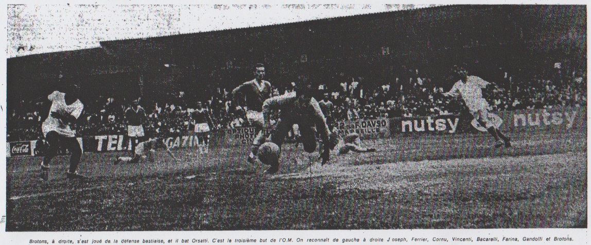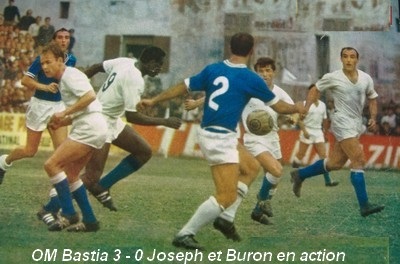 JOSEPH : vraiment difficile à dégonfler. Se battit finalement aux quatre coins du terrain et eut le grand mérite de se trouver là à point nommé pour obtenir les deux premiers buts. GAUTHIER : Fit plus que jeu égal avec René Ferrier. Le capitaine bastiais, son adversaire direct. Précieux par son calme, son expérience et sa technique. FIAWOO : Avant qu'il ne frappe Vincenti, n'avait pas réussi à se débarrasser de l'étroite surveillance de Vincenti et Cornu. BROTONS : dans la tempête, multiplia les accélérations, les exploits techniques, les dribbles ahurissants. Grâce à deux actions personnelles qui firent se dresser le stade, libéra l'O.M. de tout souci. Le meilleur du match. BURON : Face aux terribles Farina, joua en finesse et réussit à inquiéter maintes fois son garde du corps, à déborder et à tirer. BASTIA : assez décevants ORSATTI : A côté de bonnes parades, nous parut assez mal inspiré sur le premier et le troisième but qu'il pouvait peut être éviter. FARINA : Quelquefois trompé par Buron, n'en fut pas moins l'un des meilleurs Bastiais. Un terrible combattant auquel il ne fait pas bon se frotter. GANDOLFI : Match honorable contre Joseph qui lui en fit voir de rudes et qui ne l'oublions pas marqua deux buts. VENTENTI : Très bons en défense, où sa taille, sa rudesse, son jeu de tête le rendent difficilement à prendre en défaut, mais imprécis en attaque. CORNU : Le meilleur Bastiais et l'un des meilleurs sur le terrain, comme bétonneurs d'abord, comme arrière central classique par la suite. Donna le ton à la défense Corse. RACCARELLI : Tenta vainement de tenir Brotons en laisse. Un Brotons particulièrement déchaîné qui le domina évidemment de bout en bout. VESCOVALI : Ne put jamais échapper à la surveillance très stricte Bérange. FERRIER : N'eut pas le rayonnement que l'on pouvait attendre d'un international de sa réputation. Ne réussit jamais à "asseoir" le jeu de son équipe. SANSONETTI : Il était difficile de jouer avant-centre hier à l'Huveaune. Étienne ne put jamais franchir le mur marseillais. PADOVANI : Ne fut pas un grand secours à son camarade Sansonetti et subit la loi excellent Sejnera. BOUKHHALFA : Sa finesse de touche de balle des pieds et de la tête ne put lui permettre de prendre Tassone en défaut. M. BOIS : Il se tira avec adresse du guêpier dans lequel on l'avait fourré, réussissant, non pas à tenir les joueurs en main, mais à limiter les dégâts Louis DUPIC |