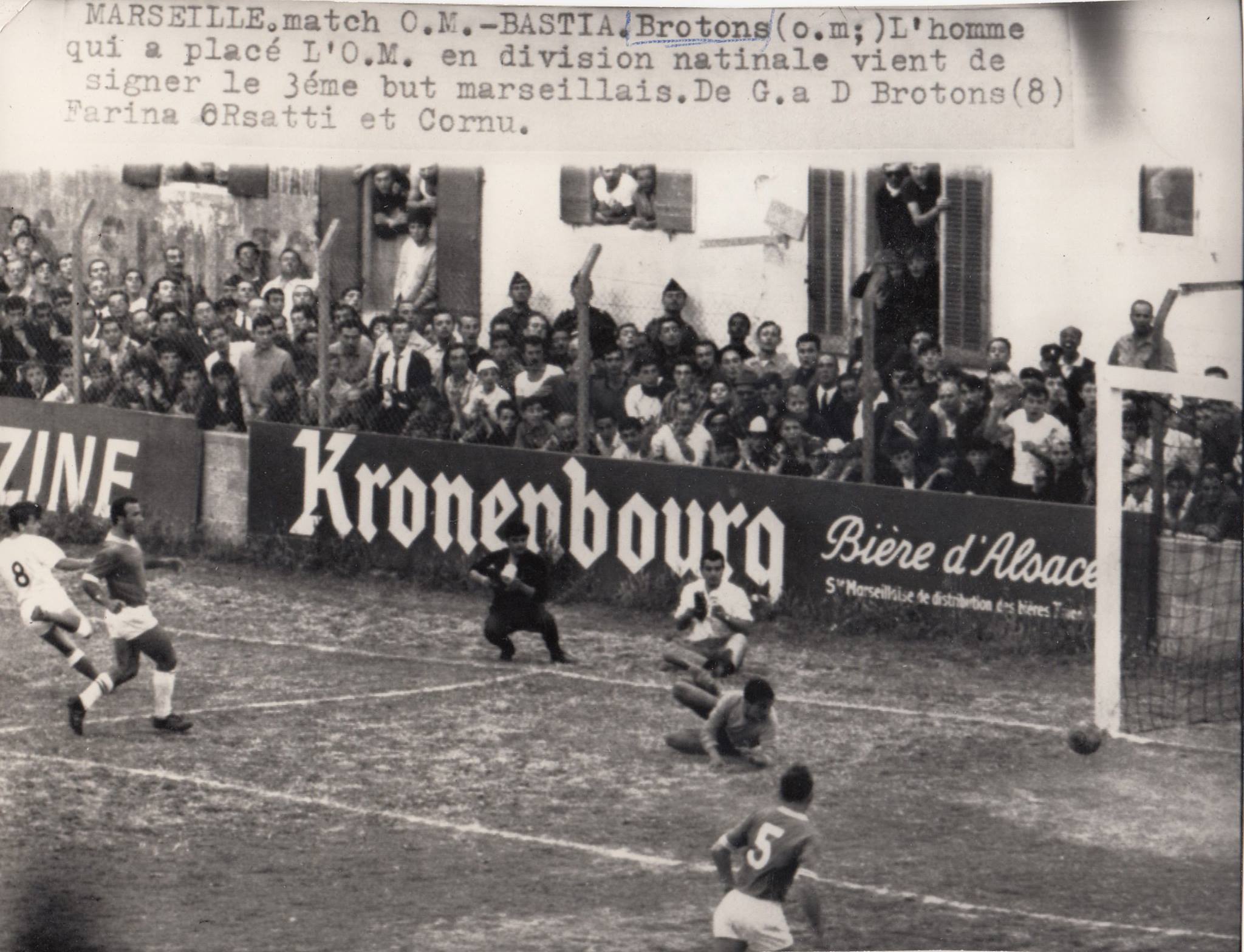 Fiawoo se relève, fou de rage, fonce sur Vincenti et, par derrière, lui administre un maître "coup de boule" dans la nuque. Le coup du lapin. Vincenti s'effondre. L'arbitre qui n'a rien vu, laisse le jeu se poursuivre au milieu de la confusion la plus totale. On croit alors redouter le pire, les incidents se multiplient dans tous les coins. Enfin Fiawoo expulsé et conduit de force aux vestiaires par un commando de dirigeants de l'O.M. C'est à la fois horrible, crispant et inquiétant pour la suite de la partie. 35ème : BROTONS sauve le match Le jeu venait à peine de reprendre, dans les plus mauvaises conditions, l'O.M. jouant à 10 contre 11, quand Brotons s'empare du ballon. Nous allions alors être les témoins admiratifs d'un merveilleux slalom, l'un des plus beaux jamais vus sur un terrain de football et surtout à l'Huveaune qui se prête assez mal à ce genre d'exercice. Balle au pied, Brotons mystifia un, deux, trois, quatre défenseurs corses, pour, au bout de sa course, donner une balle du but à Joseph. Ce dernier rata complètement son tir et marqua tout de même. O.M. : 2 - Bastia : 0. Ce but calma le sesprits, le football ayant pris le dessus, de manière éclatante, sur le catch et la savate. 51e minute : Encore BROTONS Au début de la deuxième mi-temps, les Corses jouèrent leur va-tout, mais Escale n'avait pas eu encore un véritable arrêt à faire. Cependant, à 11 contre 10, leurs chances pouvaient être tenues pour non négligeable, quand Brotons à nouveau... À la 51e minute, il s'empara du ballon, "mit dans le vent" ses adversaires, s'infiltra sur la gauche... et, constatant que Joseph était hors-jeu, marqua lui-même d'un revers de pieds. Orsatti, en la circonstance, n'ayant pas été irréprochable. O.M. : 3 - Bastia : 0 La cause était définitivement entendue. Ne jouez pas avec le feu Par la suite la partie sombra dans la nuit et dans l'ennui. Bastia rata deux occasions de buts. Escale réussit enfin un vrai arrêt sur le seul bon tir de son ami "Sanso", mais l'O.M. en contre-attaque, faillit saler l'addition : deux tirs de Buron, un de Joseph, un autre de Lopez sur coup franc, etc... Brotons fit durement connaissance avec la main courante et fut la victime d'un incident tragico-comique. Une petite bombe, la dernière explosa sous lui, lui brûla sa culotte... On ne joue pas avec le feu... Et, comme en mai 63, tout se termina sur un tour d'honneur : celui de la "remontée" en Nationale. Maurice FABREGUETTE |