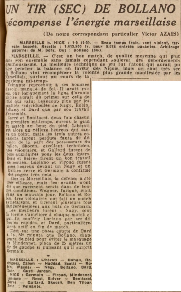 Il aurait pu cependant la ressaisir par la suite sans les hésitations incompréhensives de Carré principalement au moment de la conclusion. Mais avec le vent dans le dos les Olympiens qui s'étaient jusque-là montrés très volontaires allaient s'imposer plus nettement et concrétiser leur avantage - malgré de rapides contre-attaques niçoises aux combinaisons agréables - par un but de Bollano (64me minute) qui surprit Germain. Hier la volonté marseillaise a primé la meilleure technique d'ensemble des Niçois qui, d'après leur entraîneur Veinante, ont surtout manqué de foi. Malgré ce, la rencontre fut agréable à suivre. L'O.M. réalisa notamment une de ses meilleures exhibitions de la saison à Marseille, encore que la coordination n'a pas été parfaite entre demis et avants. Mais si les actions des offensives des olympiens furent moins liées que celles des avants niçois elles s'avérèrent plus dangereuses grâce aux qualités individuelles de Nagy, très volontaire ; de Robin, précieux par ses services et son sens du jeu, de Bollano qui lutta avec hargne, et Dard, actif en deuxième mi-temps. Toute la défense doit être créditée d'un bon match. À Nice, Skocen, Bonifaci, Belver, Rossi, Luciano et Germain furent les meilleurs. Victor AZAIS |