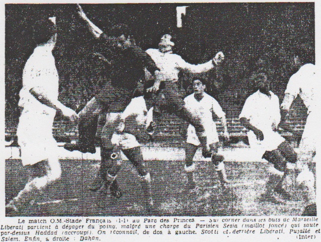 Le Stade égalise Troisième phase. En fin de mi-temps, et tout au long de la 2me mi-temps, le Stade domine territorialement. Mais sa dentelle est moins bien tissée qu'au début, par contre coup, les contres attaques marseillaises, quoique plus nombreuses, sont moins perçantes. Nagy et Dard ratent chacun une belle occasion. Le Stade joue avec l'énergie du désespoir, à 10 car Gaulon a été touché. Mais l'O.M. est également affaibli, Nocentini a un coup au côté. Finalement Rodriguez surgit entre Hadad et Salem et ajuste le shoot égalisateur. Les deux dernières minutes ne changent rien. Grégoire, Drouet, Colonna, Rodriguez, Arnaudeau, furent dans l'ordre les meilleurs stadiste, tandis que Laborde fut peu actif et Sesia bien pâle. Marseille, défense absolument remarquable, Scotti fut un des meilleurs hommes sur le terrain et Pujalte eut des interventions très heureuses mais demis d'aile et inters durent souvent jouer la défense, où ils sont moins à l'aise qu'en attaque. Chez les avants on ne pouvait procéder que par contre-attaques trop rares, mais la "manière" olympienne s'y eut retrouvé souvent J.P. CATHALA |