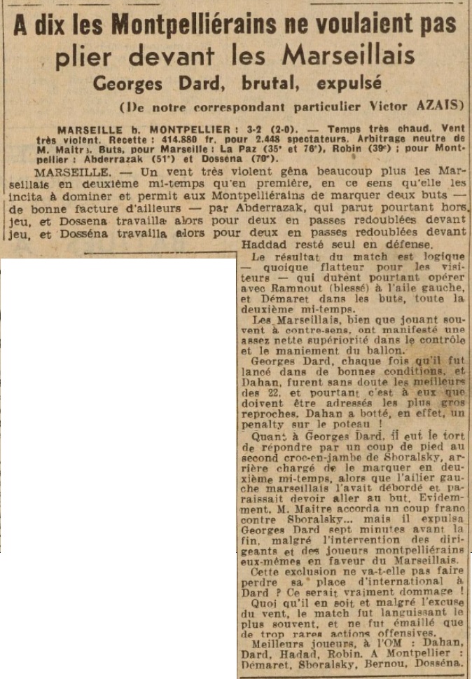Après des situations diverses, Samzun à une belle occasion dont il ne sait pas profiter (19'), tandis que Ramnout doit dévier en corner (22'), une reprise de volée de La Paz, sur action Robin - Nagy. Deux attaques de Dard, enfin bien lancé par Pujalte, puis de Robin - Nagy, nous amènent à la 35' minute. Sur ouverture de Nagy, La Paz s'avance posément feinte la passe puis le shot et trompe tous ses adversaires et Ramnout. Quatre minutes après, une combinaison Scotti-Dahan-Pujalte permet à Robin de battre Ramnout pour la deuxième fois. Après deux shots de Dossena, et un corner pour Montpellier, la mi-temps est sifflée. À la reprise, Desmaret joue dans les bois, Sboralski arrière droit, Dossena avant-centre et Ramnout ailier gauche. Malgré ce handicap et celui du vent, les Montpelliérains se montrent les plus actifs. À la 51' minute une combinaison Bernou-Abderrazak permet à ce dernier, hors-jeu semble-t-il, de battre Liberati de près. Les avants de l'O.M. se laissent alors souvent prendre au hors-jeu que jouent les défenseurs montpelliérains. Un fauchage de Nagy par Roussy (53') vaut un penalty que Dahan shoote sur la verticale mais un autre de Bernou par Pujalte (66') n'est pas sanctionné. L'O.M. joue au ralenti, abuse des passes en arrière et à la 70' minute, Ramnout, invalide prend la balle à Dahan, lance Mateo, Abderrazak sert Dossena qui égalise. Montpellier se replie alors en défense, l'O.M. va-t-il être obligé de concéder un nul ? Non, car sur corner de Dard (76'), Nagy prolonge de la tête sur La Paz qui, de l'extérieur du pied droit, assure une victoire peu probante à son équipe. Enfin, à la 83' minute, Dard est sorti du terrain par l'arbitre, pour avons eu le tort de répondre par un coup de pied a deux croc-en-jambe de Sboralski, alors qu'il paraissait devoir aller au but. Dahan, Dard, Hadad, Robin, Demaret, Sboralski, Bernou et Dossena furent les meilleurs acteurs d'une pâle partie. Victor AZAIS |
