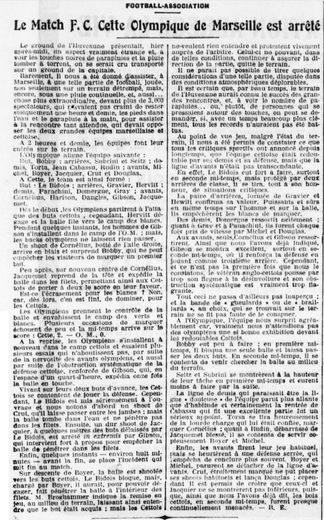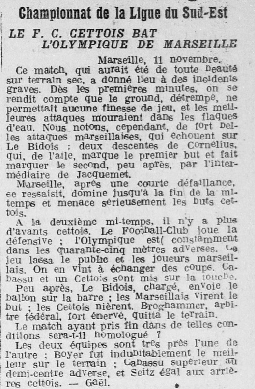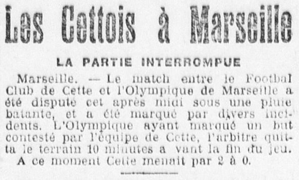 Nota : La rencontre sera arrêté à la 82' minutes, les Cettois refusent de reprendre le jeu suite à l'égalisation Marseillaise. L'arbitre de la rencontre quitte le terrain. Le match sera annulé, il sera programmé le 09 décembre mais il ne pourra se jouer à cause de la pluie, finalement il se jouera le 11 mai . |