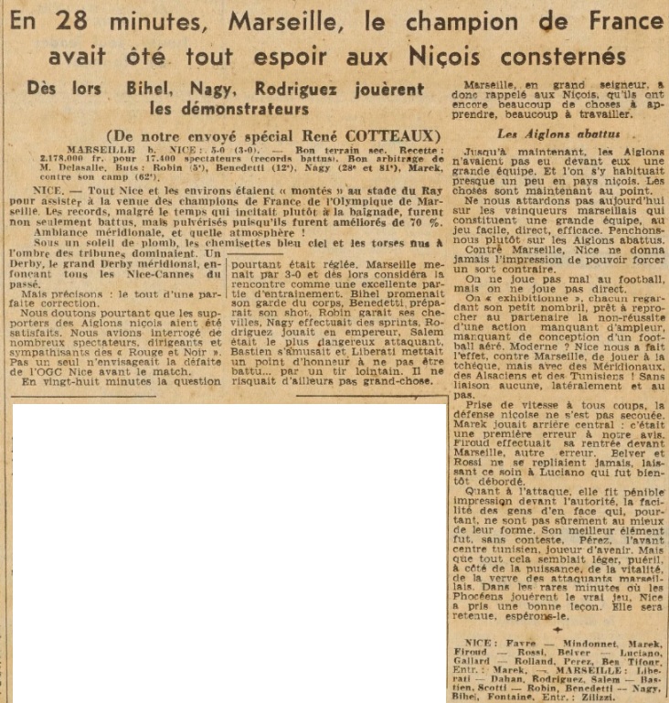 L'OGC Nice a déçu. Pour le moins qu'on puisse dire, c'est qu'en deuxième mi-temps, le jeu se déroula le plus souvent dans la moitié du terrain défendue par les marseillais, les avants niçois qui combinaient fort agréablement - du reste au milieu de terrain - se montrèrent d'une maladresse insigne devant les bois à telle enseigne que Libérati eut en tout et pour tout, deux shoots dignes de ce nom à stopper. Il le fit d'ailleurs avec sa maîtrise et son élégance coutumière. A L'OM, nous devons citer l'action constante et intelligente de Bihel, la brillante exhibition de Nagy à l'aile droite - qui, s'il fut plus effacé en deuxième mi-temps, ne se montra pas moins fort, entreprenant, chaque fois qu'il fut lancé dans les bonnes conditions : celle fort éfficede Scotti qui sut éclaircir le jeu , le volontaire activité de Bastien , le match fort méritoire de Rodriguez , enfin Salem et Dahan s'attachèrent à Rolland et Ben Tifour et les deux autres ailiers niçois ne brillèrent pas outre mesure , encor eque Rolland se signala en deuxième mi-temps par une activité débordante tout à l'honneur des deux arrières olympiens . Fontaine joua avec volonté ; Robin se signala par ses ouvertures précises et Benedetti par ses shoots. A Nice, Belver fut de loin le meilleur élément. Après lui, Luciano, en première mi-temps surtout, Perez pour son action intelligente, Rossi pour son activité. Rolland et Firoud pour leurs dernières quarante-cinq minutes furent les plus satisfaisantes d'un onze. |