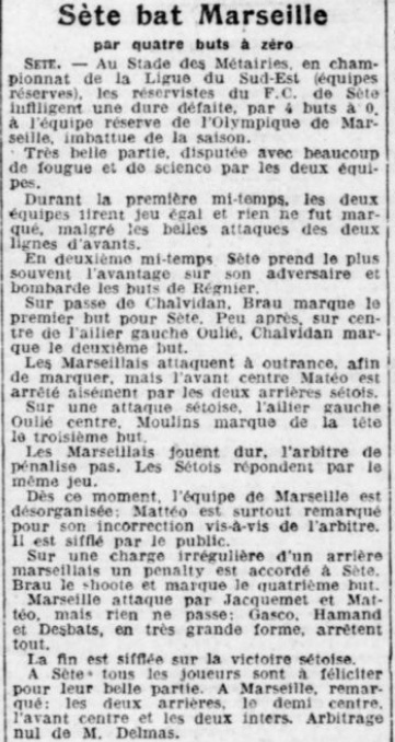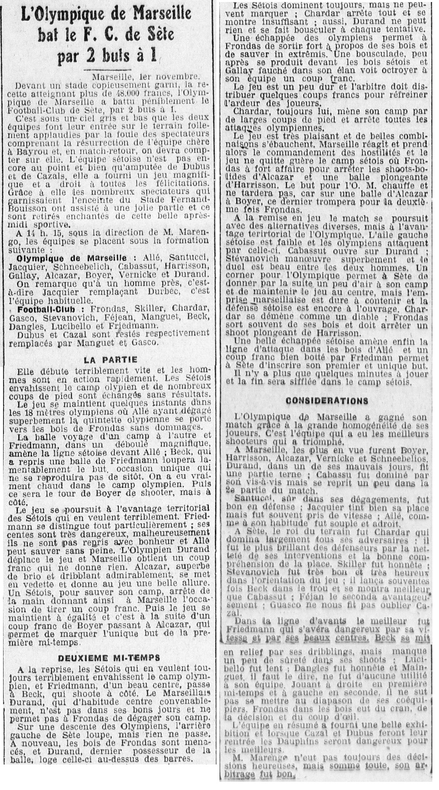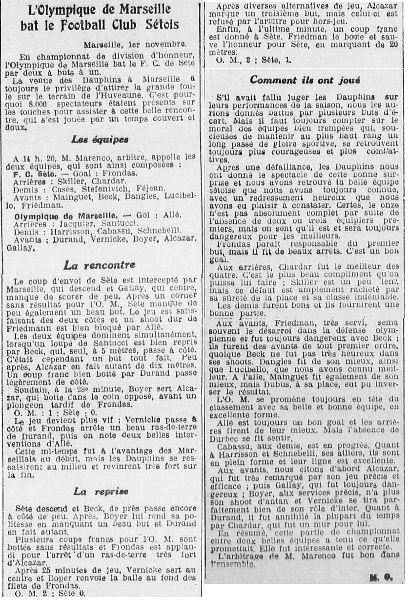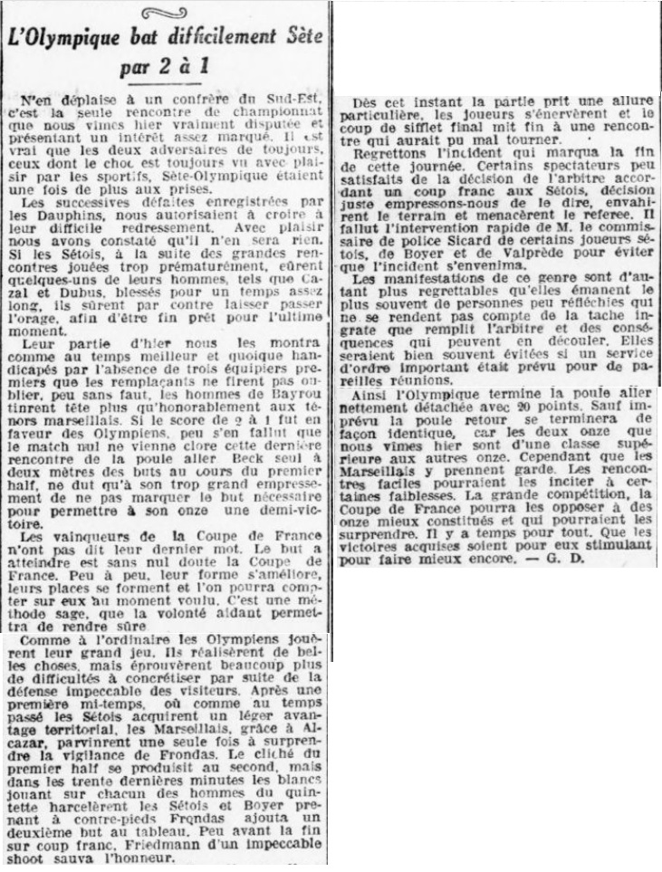 Nota : Après le match, la foule conspue l'arbitre Marenco qui doit quitter le terrain escorté par les gendarmes. Il a annulé deux buts à Alcazar durant la partie |