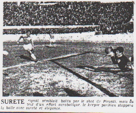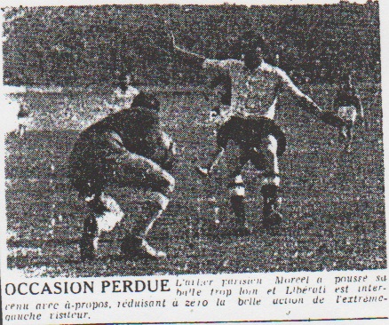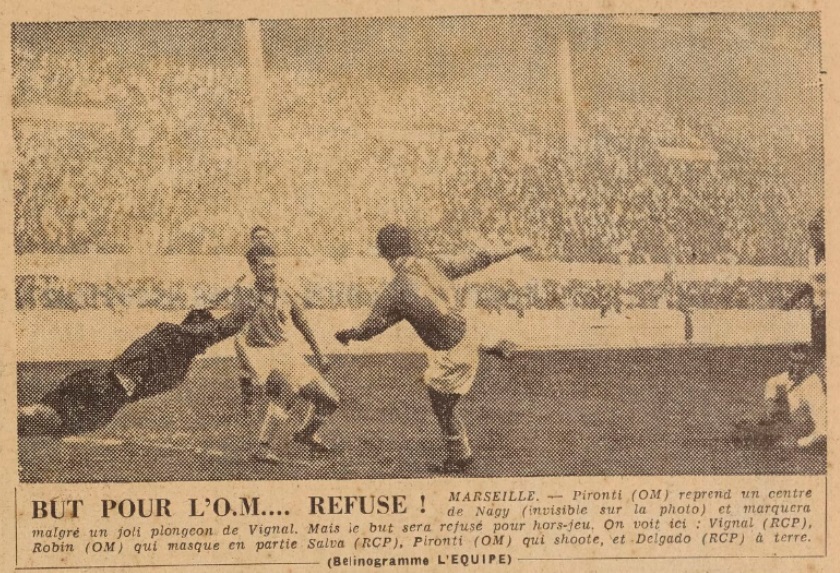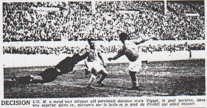 Le stade est archi-comble, lorsque M.Delasalle appelle les deux équipes sur le terrain. Il fait un soleil radieux. Les deux équipes, très applaudies, s'alignent dans les formations annoncées. A savoir : O.M. : Libérati, Dahan, Salem, Bastien, Rodriguez, Scotti, Nagy, Robin, Bihel, Bénédétti, Pironti. Racing : Vignal, Arens, Salva, Delgado, Lamy, Leduc, Gabet, Nicolitch, Quenolle, Teissier, Moreel. Les olympiens jouent en bleu et donnent le coup d'envoi. Dés le début, les deux équipes se valent, mais les locaux ont l'initiative de la première attaque, c'est Libérati qui est le premier en danger, sur une balle que Dahan ne peut stopper et que Moreel pousse trop loin. Un beau shot de Robin, reprenant une tête de Bihel passe juste à coté des bois de Vignal, tandis qu'un beau travail de Nagy à l'aile n'est pas exploité, car il ne trouve personne à la réception. Et tandis que Rodriguez et Salem font bonne garde en défense. L'O.M. emmener à proposer son jeu grâce au travail de Bastien et Scotti au centre du terrain et Leduc doit dégager en touche un essai de Pironti. L'O.M. porte le jeu dans le camp adverse, mais une contre-attaque des parisiens s'avère dangereuse. Et sur le renvoi de Dahan, Nicolitch reprend de volée et la balle passe juste à coté de la verticale. Les locaux, cependant ont le vent en poupe. Ils poussent à l'attaque, mais les défenseurs racingmen par un marquage serré, défendent leurs bois avec sûreté. Une contre-attaque de Quenolle se termine par un shot trop haut, tandis qu'une percée de Bihel en position d'ailier gauche, échoue sur les bois. Une action de Bastien, Scotti, Robin, Scotti oblige Vignal à effectuer un plongeon audacieux et un coup franc dégagé un moment les bois du Racing menacé. Pironti ayant tenté de s'emparer de la balle dans les mains de Vignal à terre. Le jeu est sec, car les joueurs se marquent de près mais grâce à Bastien et Scotti qui poussent à l'attaque, l'O.M. continue à imposer son jeu, sans mettre Vignal réellement en danger. Les parisiens ne restent pas inactifs et contre-attaquent à chaque occasion. Ce sont eux du reste qui, sur une intervention défectueuse de Rodriguez, obtiennent le premier corner à la 26ème minute. La défense du Racing continue à se montrer à la hauteur de sa tâche et les avants locaux n'ont pas souvent l'occasion de se trouver en position de shot. Pourtant, Vignal doit exécuter une belle parade sur une tentative de Bénédétti, consécutive à un centre de Salem. Le premier but de Bénédétti Une action de Gabet, une autre de Nagy, un bon shot de Bastien dont le rebond trompe Vignal mais l'horizontale nous amène au point culminant de la rencontre. Il reste quatre minutes à jouer, lorsqu'une combinaison Scotti, Robin, met Bénédétti en possession de la balle. Une feinte qui trompe Delga, car bien do, un shot sec part et Vignal est battu, malgré une superbe détente. |