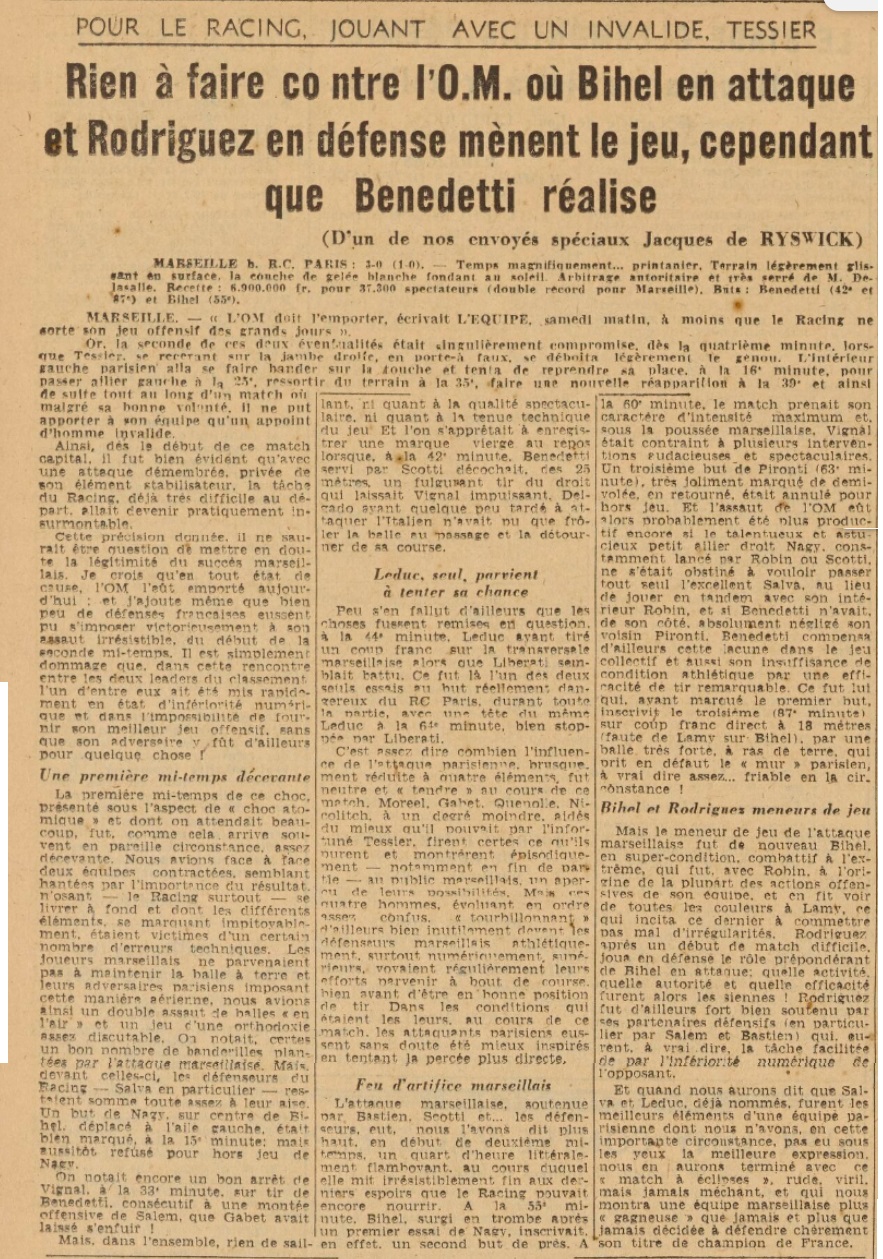 Le shoot de Benedetti Les champions de France ont mérité leur succès. Ils ont réalisé, hier une excellente exhibition et un grand match. Sous l'impulsion de Bastien et Scotti qui firent la loi au milieu du terrain, l'équipe imposa le plus souvent son jeu. Elle fit preuve d'autorité et de décision et certaines de ses actions furent du grand football. La défense flotta parfois, mais elle sut toujours se reprendre au bon moment. Libérati se montra très sur dans ses interventions, Salem réalisa une excellente première mi-temps mais fut sans faisant dans l'ensemble, Dahan opéra avec facilité et se retrouva complètement après le repos, Rodriguez, mis à part quelques interventions défectueuses qui ne tirèrent jamais à conséquence, s'imposa constamment par son adresse et son autorité et fut un des meilleurs hommes de cette rencontre, avec Bastien et Scotti. En attaque, Benedetti se montra le plus précieux et son shot fut déterminant, mais Bihel et Nagy, malgré la surveillance dont ils furent l'objet de la part de Lamy et Salva, eurent des actions de grand style qui trompa bien souvent la vigilance de leurs anges gardiens, Robin se dépensa beaucoup, il fut le trait d'union entre l'ailier et l'avant-centre et ses ouvertures sur Nagy créèrent souvent des situations périlleuses pour le Racing. Quant à Pironti, après une première mi-temps assez timorée, il se montra sous un jour plus favorable en fin de match. Victor Azais |