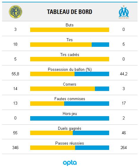 ______________________________________________________________ 6' : Côté droit, Paulo Sergio n'est pas attaqué et arme la première frappe du match, aux 25 mètres. La tentative du Portugais passe à côté du montant gauche de Bracigliano. 11' : Encore une fois, Paulo Sergio prend sa chance d'un tir à mi-hauteur aux 25 mètres, côté droit. Le tir du Portugais rate le cadre et s'envole dans le ciel de Nicosie. 13' : Côté gauche, Dickson pense pouvoir se présenter seul face à Bracigliano après avoir fait la différence face à N'Diaye. Le joueur de Limassol est finalement stoppé dans son élan pour une faute sur le défenseur. 21' : Sur un ballon en retrait, Bracigliano se troue complètement sur son dégagement au pied ! Le ballon revient sur Sa mais Fanni intervient in extremis pour sauver sa formation 29' : Sur un centre venu de la droite, Dickson est idéalement trouvé au second poteau, libre de tout marquage. A bout portant, le Ghanéen s'essaie à une déviation du pied droit qui rate le cadre 36' : Enfin ! Après 36 minutes de jeu, Rémy est trouvé à l'entrée de la surface, côté droit. L'ancien Lyonnais se met sur son pied droit et arme un tir enroulé qui passe au-dessus du but adverse. 41' : Sur un corner frappé côté droit par Edmar, Bracigliano se rate complètement sur sa sortie aux poings. Sa surgit pour placer une puissante déviation de la tête ! Le ballon rebondit sur la transversale avant de franchir la ligne 67' : Nikolaou est trouvé sur son côté droit et adresse un centre enroulé au second poteau où Sa place une déviation décroisée de la tête qui passe juste à droite du but de Bracigliano 79' : Côté droit, Dickson déborde Mendes et adresse un centre fuyant au second poteau où Edmar, idéalement placé, marque d'une frappe décroisée à bout portant 82' : Edmar enroule parfaitement un corner côté gauche. Le ballon arrive au premier poteau pour Dosa Junior, libre de tout marquage, qui marque d'une déviation décroisée de la tête aux six mètres 88' : Sur un nouveau corner de Paulo Sergio, Dede place une tête plongeante au premier poteau qui rate le cadre pour quelques centimètres 89' : Santiago se charge d'un corner, côté droit. Mendes est trouvé au second poteau mais ne parvient pas à cadrer sa déviation décroisée de la tête à bout portant -------- 19 tirs à 4 pour Limassol, aucune frappe cadrée pour l'OM. Tout est résumé au terme d'un match raté de bout en bout par une équipe C de l'OM dominée dans tous les compartiments du jeu. |