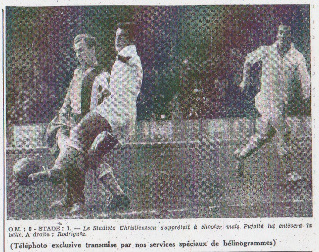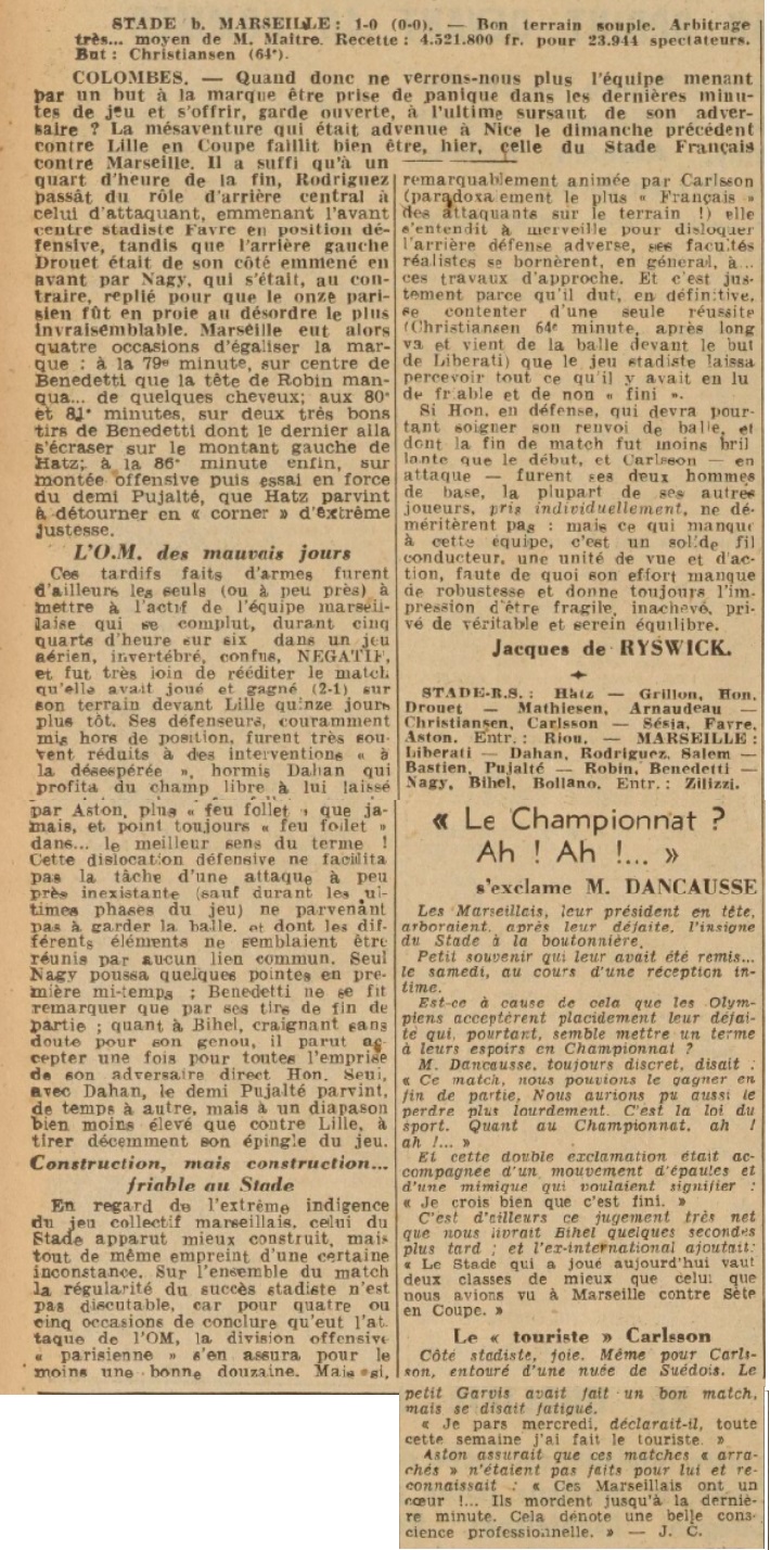 Nagy, Pujalte Depuis dix minutes le jeu avait repris. Effectivement, la cohésion semblait revenue au sein de l'équipe marseillaise. A tout coup Nagy, sérieusement marqué par Drouet bousculé par Hon, parvenait à ses fins. Ses centres trouvaient Hatz à la réception ou le heading de Hon. Et, fort curieuse constatation, les attaquants olympiens manquaient de réalisation devant les buts. L'égalisation semblait, malgré ce, imminente. Cette stérilité permit au Stade de se reprendre en fin de match. Christiansen seul manquait les buts. Peu après Salem sortait de sa cage une balle d'un furieux coup de tête. Les contre-attaques repartaient sur Bollano actif, mais imprécis. Au centre, Bihel complètement muselé par Hon ne pouvait rien. Et ce fut le but à 64e minute, ou après une série de passes, Carlsson centrait sur Christiansen, lequel à travers une forêt de jambes aidé semble-t-il par un olympien, marquait le but vainqueur. Les assauts marseillais continuaient pourtant à se multiplier au petit bonheur. Robin essaya bien d'y mettre de l'ordre. Pujalte de les rendre dangereux. En vain, Mathiesen, Hon, Arnaudeau, demeureraient intraitables. Grillon et Drouet tenaient tête. Bastien sauvait encore. Salem aussi, mais c'était trop tard, le Stade avait gagné. Le responsable : Carlsson Nous vous avons dit que Carlsson, qui repart en Suède, fut l'âme de son équipe. Grand joueur, l'O.M. peut le désigner comme le grand artisan sa défaite. Avec lui, Christiansen, Hon, Sesia et Grillon se mirent au banc de l'évidence. Côté Olympien, d'abord Rodriguez égal à lui-même à lui-même, énergique, travailleur, adroit. Puis Bastien averti, courageux, technique. Nagy encore, qui fut en réalité le seul avant dangereux sous le maillot blanc. C'est Bihel qui nous procura une déception. Il semblait lié, rivé à ce Hon qui ne le ménageait pas. Benedetti joua par à-coups. Robin sans éclat, mais honnêtement. Peu de choses sinon rien à reprocher à la défense qui vit un Dahan très actif. Enfin Liberati devait plaire à Colombes. Ce qui veut tout dire. Les sportifs marseillais qui étaient à Colombes formuleront, des regrets. Bien normalement. L'O.M. a manqué une occasion. À sa portée. Car, répétons-le, ce ne fut pas le Stade qui fut son plus grand adversaire, mais bien cet attentisme, cet engourdissement qui fut hier, surtout chez ses avants la marque de l'O.M. |