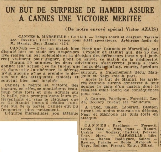 Cannes. Ne serait-ce que le seul nom de l'O.M. et le stade des Hespérides est complet quand le coup d'envoi est donné. En plus de ce prestige, il y a évidemment l'enjeu de la partie, car si les phocéens pouvaient encore espérer coiffer Reims et Lille sur le poteau, de leur coté les azuréens qui se débattent avec coeur, pour sortir de l'ornière dans laquelle leur saison décevante les a plongés, disputent un match capital. Une victoire leur permettrait tous les espoirs. Le lever de rideau permet de voir la sélection du Var battre l'équipe correspondante des Alpes-Maritimes, puis ce sont les cadets d'Ollioules qui s'assurent la qualification pour matcher en finale du championnat du sud et les cadets du SO Montpellier au détriment des locaux. Et c'est l'entrée des olympiens sur le ground des Hespérides, ils sont suivis peu après par les cannois. Aucune modification dans les équipes qui s'alignent dans les formations suivantes : Cannes : Pardigon, Fornetti, flack, Mus, Lerda, Pons, Catani, Hamiri, Scolary, Lushta, Pelazzo . O.M. : Libérati, Dahan, Salem, Bastien, Rodriguez, Pujalte, Nagy, Robin, Bollano, Mahjoub, Pironti . Cannes démarra très rapidement, les locaux plus vite en action attaquent, mais ne coordonnent par leurs efforts, alors que sur une passe de Mus à Pardigon, celui-ci doit intervenir dans les pieds de Nagy qui s'était dangereusement avancé. Le jeu est agréable à suivre et Mahjoub volontaire essaye de partir mais Fornetti ne lui laisse pas le temps d'ajuster son tir et Pardigon renvoie encore. L'O.M. battu à Cannes A la 13e minute, Lushta d'un retourné donne la balle à Hamiri, celui-ci d'un magistral shoot sous la barre surprend Libérati qui tente, mais vainement de stopper la balle. La chorale azuréenne s'en donne à coeur joie car l'espoir renaît, cependant après ce coup heureux, Hamiri est handicapé par un placage. Les olympiens se montrent alors plus agressifs et attaquent à leur tour. Un centre de Nagy est bien reprit par Mahjoub qui capte la balle dans les mains de Pardigon, Bollano survient en même temps que Pironti, ces deux-là se gênent et c'est ainsi une belle occasion de manqués. La défense locale extrêmement accrocheuse ne permet pas aux avants visiteurs de venir inquiéter Pardigon qui se montre du reste sous un très bon jour. La vitesse du jeu ne ralentit guère et le duel Nagy-Flack d'une part et celui de Rodriguez-Scolary de l'autre ne manque pas d'attrait. On note une jolie combinaison Robin, Nagy, Bollano qui se termine par un tir sec de ce dernier, que Pardigon sauve en plongeant. |