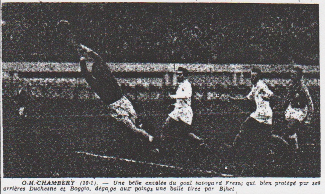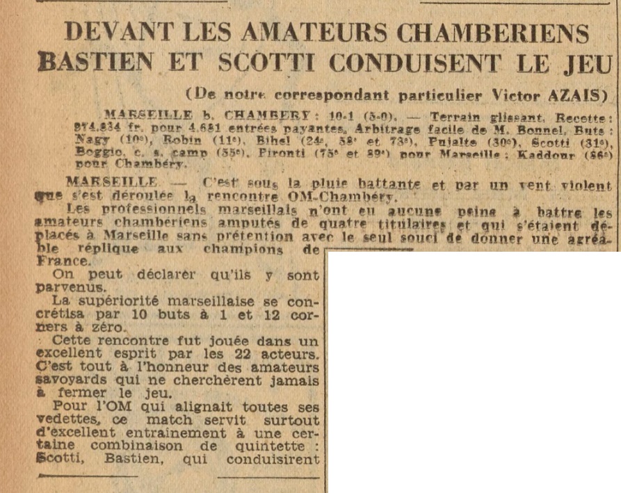 24e minute : Action Bastien-Nagy, Bihel de volée reprend le centre de Nagy et marque. 30e minute : Attaque Bihel-Pironti que Pujalte termine en but. 31e minute : Sur coup franc à 25 mètres, Scotti d'un tir splendide, réalise directement le 5e but. 55e minute : Fresse détourne un shot de Bihel, Nagy reprend la balle et tente sa chance, en voulant intervenir l'arrière-gauche Boggio dévie la balle dans ses buts. 58e minute : Bihel toue au centre et marque. 73e minute : Sur combinaison Bastien-Robin-Nagy celui-ci donne à Bihel qui s'est adroitement démarqué et qui réalise le 8e but d'un shot puissant. 75e minute : Sur passe de Bihel, Pironti score à son tour. 86e minute : Un centre de l'aile droite parvient à Kaddour, contre lequel Gallian n'intervient pas assez franchement et l'avant-centre bat Libérati. 89e minute : Pironti met fin à une poussée olympienne en battant Fresse pour la 10e fois. A noter que l'O.M. obtint 13 corners en première mi-temps , 5 en deuxième. O.M. : Libérati, Gallian, Salem, Bastien, Rodriguez, Scotti, Nagy, Robin, Bihel, Pujalte, Pironti. Chambéry : Fresse, Boggio, Duchêne, Benamou, Guiguesson, Rigoni, Perrier, Durand, Kaddour, Lorius, Léonardi. Victor Azais |