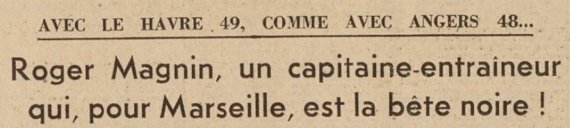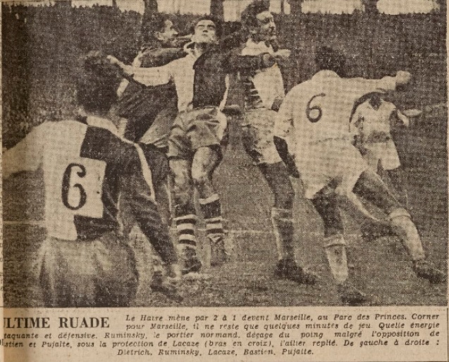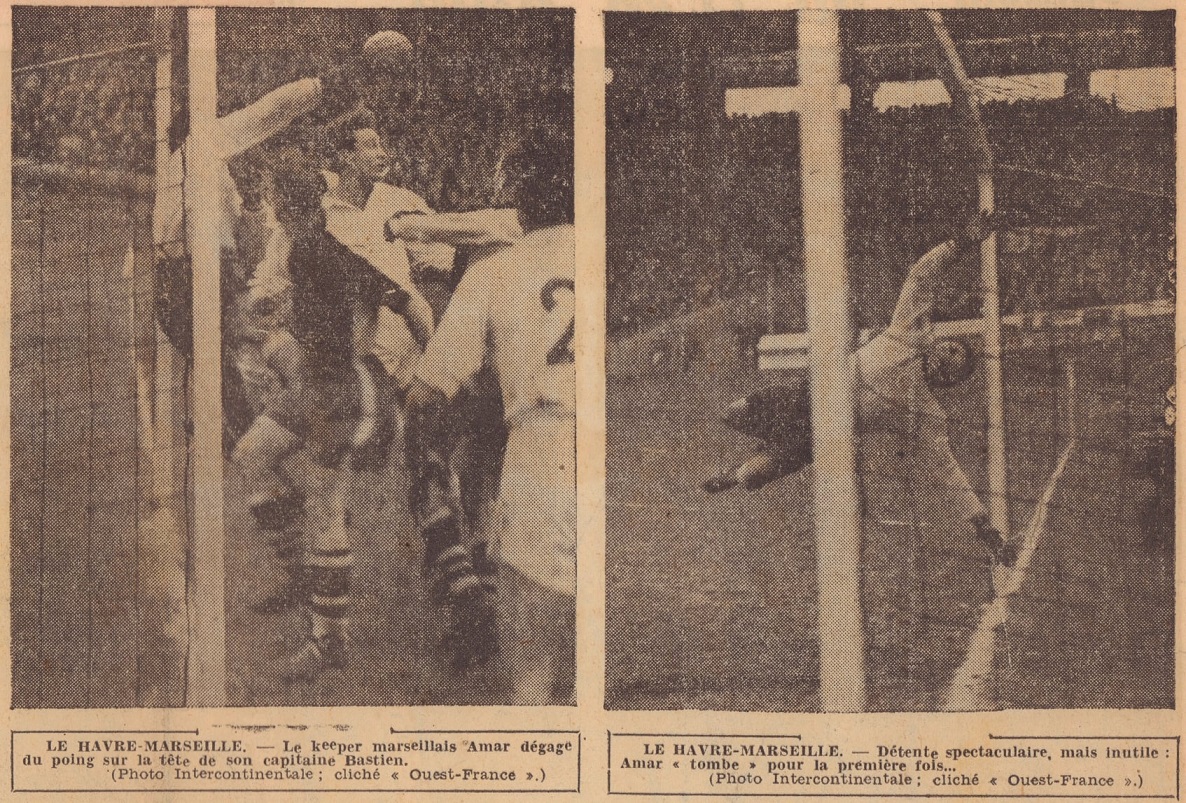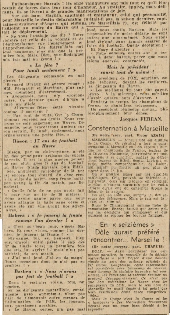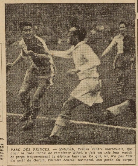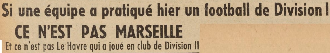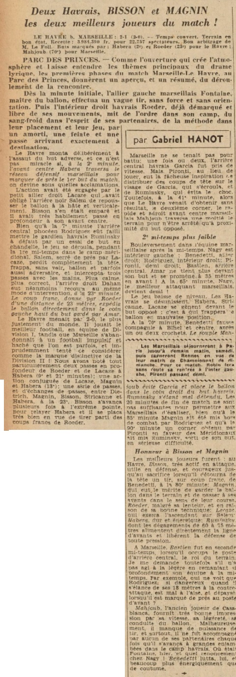Paris (A.F.P.) - Les havrais, qui, il y a dix jours, n'avaient pu, en raison de l'excellente tenue de la défense méridionale, obtenir une qualification qui justifia leur net avantage territorial. L'on acquis hier, du fait de la médiocre partie par cette même défense, en effet, dés le coup d'envoi. Les arrières méridionaux n'apparurent pas à leur aise et cette impression se confirma tout au long de la première mi-temps. Dans ces conditions, les avants méridionaux, presque constamment sevrés de la balle, du fait de la position repliée de leurs demis, ne furent que rarement dangereux et la première mi-temps se déroula presque constamment à l'avantage des normands. Ceux-ci, qui avaient débutés moins contrastés, furent mis en confiance et la troisième minute, les vit ouvrir le score par Habera, sur service de Bisson. Ils maintinrent donc une pression plus ou moins vive devant les buts adverses, et Salem et Dahan, souvent déportés en arrivèrent à stopper la balle de la main. C'est ce qui leur valut plusieurs coup-francs et leur coûta un deuxième but. En effet sur une faute de ce genre du dernier nommé, Roeder tira le coup-franc et avec l'aide du poteau, le converti en but à la 22e minute. En deuxième mi-temps, Marseille modifia son équipe, Bastien passant demi-centre et Pujalte demi-droit, tandis que le ligne d'attaque se présentait comme suit ! Bénédétti, Rodriguez, Mahjoub, Nagy et Fontaine. Telle quelle, l'équipe marseillaise apparut plus équilibrée, et de fait, le jeu tourna plus souvent à son avantage. Si les normands menèrent quelques contres moins bien, le jeu se déroulant le plus souvent en territoire normand. Mais la défense normande, où Garcia fut la pierre angulaire, tint en échec, les attaques adverses et si elle dut s'incliner à la 21e minute, sur un tir de Mahjoub, qui termine victorieusement, une action de Rodriguez - Bénédétti, elle réussit néanmoins à conserver l'avantage d'un but. Et finalement, les havrais, qui avaient dominé pendant plus d'une heure, l'emportèrent fort justement par deux buts à un. |