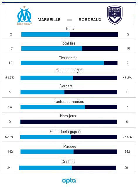 Du spectacle, de l'envie et des buts [2-2] Grâce à ce point du match nul, les Girondins conservent leur quatrième place. Les Girondins ont répondu présent au défi physique imposé par les Marseillais tout au long de la rencontre. Par Jussiê (34') et Nicolas Maurice-Belay (66'), les Marine et Blanc ont pris un double avantage. Mais en l'espace d'une minute, les Phocéens ont réussi à combler leur retard. Les deux formations ont proposé un beau spectacle cet après-midi au Vélodrome.Le scenario du match peut laisser des regrets mais, sur sa physionomie, le nul est logique. A noter la grosse partie de Cédric Carrasso. Avant match Bordeaux se déplace cet après-midi au Stade Vélodrome de Marseille. L'enjeu de cette rencontre est la quatrième place du championnat. Les Girondins sont actuellement 4èmes et devancent les Marseillais de deux points. Les Marine et Blanc sont sur une belle dynamique. Ils restent sur quatre victoires consécutives en championnat et une qualification en quart de finale de la Coupe de la Ligue. Ce choc entre deux rivaux historique promet du spectacle. Les Girondins évolueront en 4-4-2 avec Henri Saivet en soutien de Jussiê. Le onze de départ sera composé de : Carrasso (cap.) - Mariano, Planus, Henrique, Poundjé - Obraniak, Sané, Nguemo, Maurice-Belay - Saivet, Jussiê. José Anigo a opté pour un 4-3-3 avec Mandanda (cap.) - Abdallah, Diawara, Mendy, Nkoulou - Romao, Lemina, Imbula - Thauvin, Gignac Payet. Cédric Carrasso, prêt pour le combat Les attaquants marseillais posent beaucoup de problèmes aux défenseurs bordelais en ce début de rencontre. Notamment par le positionnement de Payet qui évolue entre les lignes. Gignac et Thauvin réalisent de bonnes combinaisons offensives comme à la 4ème et à la 12ème minute. Gignac puis Thauvin se présentent devant Cédric Carrasso, mais par deux fois le portier bordelais remporte son duel. Les hommes de José Anigo trouvent des espaces et se montrent dangereux. A la 17ème minute Thauvin et tout proche d'ouvrir le score suite à une superbe action. Imbula perce à gauche en une touche Gignac décale Diawara qui lance Thauvin. Suite à une superbe feinte, l'attaquant marseillais frappe et le ballon fini sa course dans le petit filet de Carrasso. Les Bordelais souffrent en ce début de match. Nicolas Maurice-Belay et Jussiê apportent le danger à l'avant. Des duels engagés Les Bordelais se sont repositionnés. Ils jouent repliés dans leur moitié de terrain et laisse moins d'espace aux Marseillais pour développer leur attaque. Les hommes de Francis Gillot cherchent Jussiê dans la profondeur. Le brésilien réalise un très gros travail à la pointe de l'attaque bordelaise. A la 24ème minute il réussit à s'ouvrir le terrain en se débarrassant de trois marseillais. Il est stoppé irrégulièrement par Imbula. Les Girondins de Bordeaux réussissent à se créer des occasions. Les duels sont engagés à tous niveaux à l'image de Diawara et Henrique qui ne se font pas de cadeau. Ouverture du score pour Bordeaux Sur un corner sortant d'Obraniak, Jussiê remporte son duel de la tête face à Romao et propulse la balle au fond des filets de Steeve Mandanda. (0-1,34') Les Phocéens tentent de réagir dans la foulée. Mais l'arrière garde bordelaise tient le choc. Cédric Carrasso s'impose dans les airs puis Henrique réussit un tacle du bout du pied devant Gignac qui s'apprêtait à frapper. Jussiê ne ménage pas ses efforts et se montre présent sur tous les duels. A la 40ème minute, il retombe lourdement sur son bras gauche et souffre du coude. Les Marseillais tentent des choses pour revenir à hauteur des Girondins en cette fin de première mi-temps. A l'image d'Abdallah, bien lancée à la 43ème minute dans le couloir droit, il centre pour Imbula. La reprise passe tout proche du montant bordelais. Deux minutes plus tard, c'est au tour de Gignac de s'illustrer. Bien décalé par Payet, Gignac excentré sur le côté droit frappe instantanément mais Carrasso s'interpose. Après un premier quart d'heure compliqué les Bordelais ont réagi de la plus belle des manières en retrouvant un bloc solide et en ouvrant le score par l'intermédiaire de Jussiê. Un excellent Cédric Carrasso permet au bordelais de rentrer au vestiaire avec un avantage d'un but. Le bloc Girondins en place Jussiê, touché au coude, ne peut revenir sur la pelouse. Il cède sa place à Julien Faubert. Henri Saivet se repositionne à la pointe de l'attaque. Il se montre très en jambe et réalise un bon pressing sur la défense marseillaise. Suite à une mauvaise passe en retrait d'Abdallah vers son gardien, Saivet touche le ballon devant Mandanda mais ne peut le reprendre. Les Bordelais montrent une solidarité défensive impressionnante. Malgré les nombreuses incursions marseillaises dans le camp girondin, la défense bordelaise reste bien en place et repousse les assaut adverse. Cédric Carrasso se montre lui aussi très rassurant. Il réalise de belles interventions sur les frappes de Gignac et Imbula (53' et 58'). Le match devient fou Julien Faubert et Mariano combinent bien sur la gauche. Le latéral droit lève la tête et centre pour Nicolas Maurice-Belay. Le numéro 19 profite de l'hésitation d'Abdallah pour passer devant et récupérer la balle. Il crucifix le portier marseillais. (0-2,66'). Les Girondins ont fait le break dans cette deuxième période. Mais les Bordelais ne doivent pas se relâcher. Les Marseillais n'ont pas dit leur dernier mot. Thauvin se procure un beau coup franc sur le côté gauche suite à une faute de Nguemo. L'attaquant marseille le tire en force au premier poteau. Carrasso réalise un superbe arrêt mais Romao est le premier sur le ballon et propulse le cuir au fond des filets (1-2,73'). Galvanisé par ce but, les Phocéens repartent à l'attaque. Sur l'action qui suit Mendy trouve Gignac dans la surface qui prend le meilleur et pousse la balle dans le but bordelais (2-2,74'). Fin