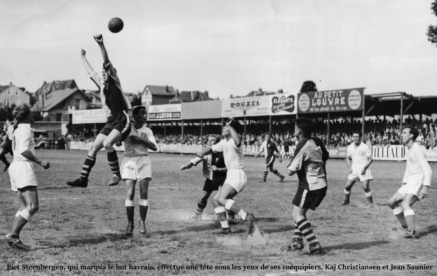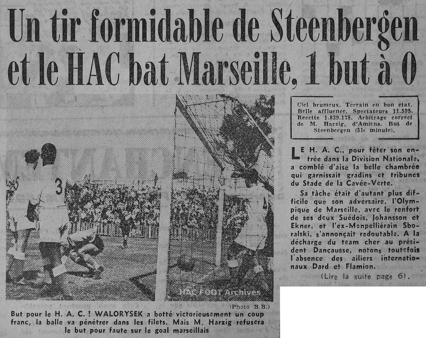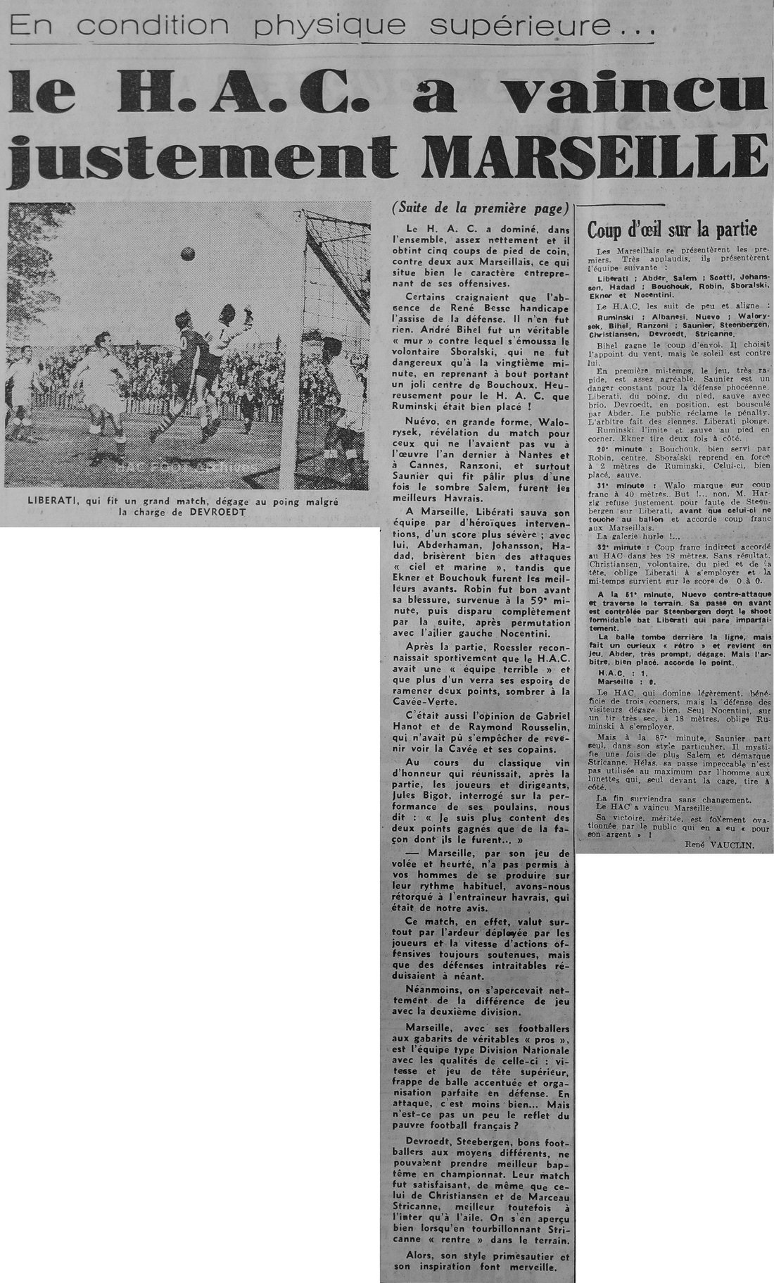 LE HAVRE. - Sous un soleil presque méditerranéen, devant plus de 10 000 spectateurs, Le Havre a fêté, hier, son retour en Division Nationale, en venant à bout de l'O.M., par un but à zéro. À dire vrai, l'O.M., presque constamment pressé sur ses buts - en première mi-temps surtout - s'est contenté de se défendre. La manière dont les Marseillais firent face aux offensives normandes manqua d'orthodoxie. Arrières et demi-ailes parèrent au plus pressé, bottant au hasard la plupart du temps, opérant sans ordre et se gênant souvent. Ce fut miracle si le H.A.C. ne réussit pas à marquer au cours de la première mi-temps (0 - 0). Un penalty lui fut refusé et, d'autre part Christianssen, Steenbergen et Stricane commirent au moment de conclure de trop flagrantes fautes de frappe. Il convient de dire aussi que Libérati - qui eut part ailleurs des renvois du poing quelque peu dangereux, sauva bien des situations par des anticipations et des plongeons opportuns. Un trou au centre du terrain Occupé en défense, l'O.M. pouvait-il s'attacher à construire ? Certes, le terrain exigu de la Cavée Verte ne facilitait pas les larges actions offensives. Mais il faut bien reconnaître que les inters marseillais, pour Robin et Ekner, isolés de leurs demi-ailes, parurent à la dérive. Ekner, volontaire, se plaça souvent sur la trajectoire de la balle. Il réussit quelques actions personnelles, mais il les couronna par des coups de bottes difficilement utilisables. Les demis, séparés de leurs inters, des avants de pointe, contraints à lutter individuellement contre leur opposant direct, voilà sans doute - sur le plan de l'organisation du jeu - les défauts qui nous parurent les plus flagrants hier. L'O.M. eut une occasion de marquer L'équipe marseillaise eut, pourtant, à la 21me minute, l'occasion (ce fut pratiquement la seule), de marquer un but. Bouchouk crocheta en effet, Nuevo poursuit son action, donna au centre une très belle balle à Robin que celui-ci plaça sur le montant vertical gauche des buts de Ruminski. Confusion en fin de match L'O.M. toujours menée par un but à zéro à 10 minutes de la fin, ne commit-t-il pas d'autre part l'erreur de maintenir alors en défense Nocentini ? Ne fallait-il pas tout tenter pour égaliser à ce moment ? On pourra rétorquer que Robin (touchait à la 58e minute), avait dû s'exiler à l'aile gauche, Ekner passant avant-centre, Zboralski et Nocentini inters. L'O.M., ainsi désorganisée, était excusable de "flotter " un instant. Le Havre fit le " forcing " Au demeurant, nous aurions tort de chercher des " si " et des "mais". On peut reconnaître à l'O.M. le mérite d'avoir su limiter les dégâts. Mais Le Havre qui fut selon l'expression pugilistique, constamment le " forcing " a mérité son succès. Celui-ci se concrétisa six minutes après la reprise. Nuevo servit Steenbergen qui, n'étant pas attaqué, botta de vingt-deux mètres une balle que Liberati qui ne put qu'amortir en lui donnant un effet qui lui permit de retomber sur la ligne après avoir pénétré dans les buts. Dix tentatives havraises en première mi-temps Avant de réussir ce but. Le Havre mis une bonne dizaine de fois Liberati qui en danger au cours de la première mi-temps : A la 5me minute, Saunier prit la balle à Scotti, la donna à Steenbersen qui prolongea sur Stricane. Celui-ci parvint seul devant Liberati mais perdit de précieux cinquièmes de secondes à chercher son pied droit. Liberati, opportunément sorti pour réduire l'angle réussi à détourner en corner. A la septième minute, Saunier centra sur Devroedt. Au moment où celui-ci se mit en position de shoote, il fut victime de la part de Haddad d'une charge irrégulière dans la surface de réparation mais M. Harzig ne sanctionna pas. À la douzième minute, Saunier - encore lui - échappa une nouvelle fois à Salem et contraignit Liberati a lui plongé dans les pieds de magistrale façon. À la vingt-quatrième minute, sur service de la tête de Christianssen, Saunier tenta une reprise de volée du gauche qui échouera de peu à côté. À la vingt-sixième minute, sur renvoi du poing de Liberati, Saunier fit une tête très basse. Le gardien marseillais, bien revenu, réussi à s'aplatir sur la balle. À la douzième minute, Saucanne s'échappant par l'aile gauche, arriva devant Liberati et place, du gauche, le ballon... Dans les bras du goal olympien. À la trente-deuxième minute, sur coup franc tiré de 25 mètres par Devroet, Liberati manqua son intervention du poing. La balle pénétra dans les filets, mais Steenbergen avait chargé irrégulièrement Liberati, le but fut refusé. À la trente-sixième minute, Liberati - vraiment à l'ouvrage - du plongé sur un shoote très précis de Stricanne. |