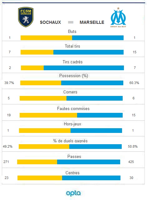 Douche froide et fin de série La série en cours des Sochaliens au Stade Bonal, quatre victoires à la suite, allait-elle se poursuivre avec la réception de l'Olympique de Marseille ? Une équipe visiteuse sous le feu des critiques suite à ses dernières prestations et qui devait une réaction d'orgueil à ses supporters. La domination stérile des Sochaliens Habille et décidé, le FCSM débutait bien face à une équipe clairement en manque de confiance. Durant vingt minutes, le jeu était équilibré et vivant. Les Francs-comtois avaient comme principal souci de ne pas se procurer d'occasion. Si les visiteurs ne semblaient guère plus en situation de marquer, ils montraient toutefois après vingt minutes qu'ils étaient capables d'être dangereux à tout moment. Suite à une passe sochalienne mal assurée, André-Pierre Gignac était près d'ouvrir le score. L'inévitable Stoppila Sunzu buteur de la tête L'occasion marseillaise avait-elle montré au FCSM qu'il était urgent de se montrer plus insistant ? Toujours est-il que trois minutes plus tard, alors qu'Édouard Butin venait de se blesser et allait céder sa place, les hommes d'Hervé Renard ouvraient le score sur un "classique" : passe décisive de Sébastien Roudet sur un corner et tête de Stoppila Sunzu. Le Zambien, pour son quatrième but de la saison, s'était détaché de tout marquage pour s'élever au premier poteau et maquer de près. Des occasions pour l'OM avant la pause... Les Marseillais se créaient des opportunités jusqu'à la pause. Le coup franc enroulé de Mathieu Valbuena n'accrochait pas le cadre de peu tandis que le une-deux du même Valbuena avec Dimitri Payet aboutissait à une frappe de près, à nouveau hors-cadre. Puis Yohann Pelé avait-il à s'employer. Notamment sur une frappe d'André Ayew en position excentrée ou encore en claquant le ballon sur la tête d'André-Pierre Gignac suite à un centre de la droite. Les visiteurs très incisifs en seconde période... L'Olympique de Marseille, au prix d'un gros pressing, entrait bien dans la seconde période. Face à des locaux reculant dangereusement, la troupe de José Anigo se faisait très menaçante. Un peu avant l'heure de jeu, l'entrée de Marco Ilaimaharitra permettait de densifier le milieu de terrain sochalien et de mieux répondre à la domination des Marseillais. Yohann Pelé n'en devait pas moins continuer à multiplier les interventions décisives. ...et qui égalisent par Nkoulou en fin de match Le FCSM pouvait compter sur l'aide de son public et, malgré plusieurs frayeurs, résistait tant bien que mal. Le Stade Bonal tremblait ainsi sur une frappe d'Alaixys Romao qui manquait de s'enrouler dans la lucarne sochalienne. Dans la dernière minute du temps additionnel, sur un corner évitable, les Sochaliens craquaient. Yohann Pelé opposait une belle parade sur une tête de Lucas Mendes, mais Nicolas Nkoulou marquait de la tête à bout portant. Une égalisation synonyme de match nul en forme de défaite pour les locaux. |