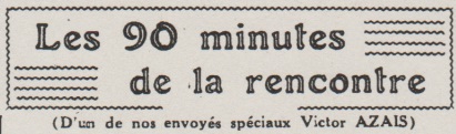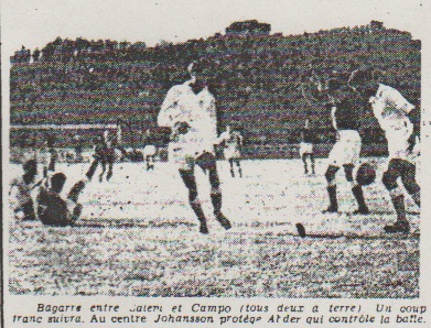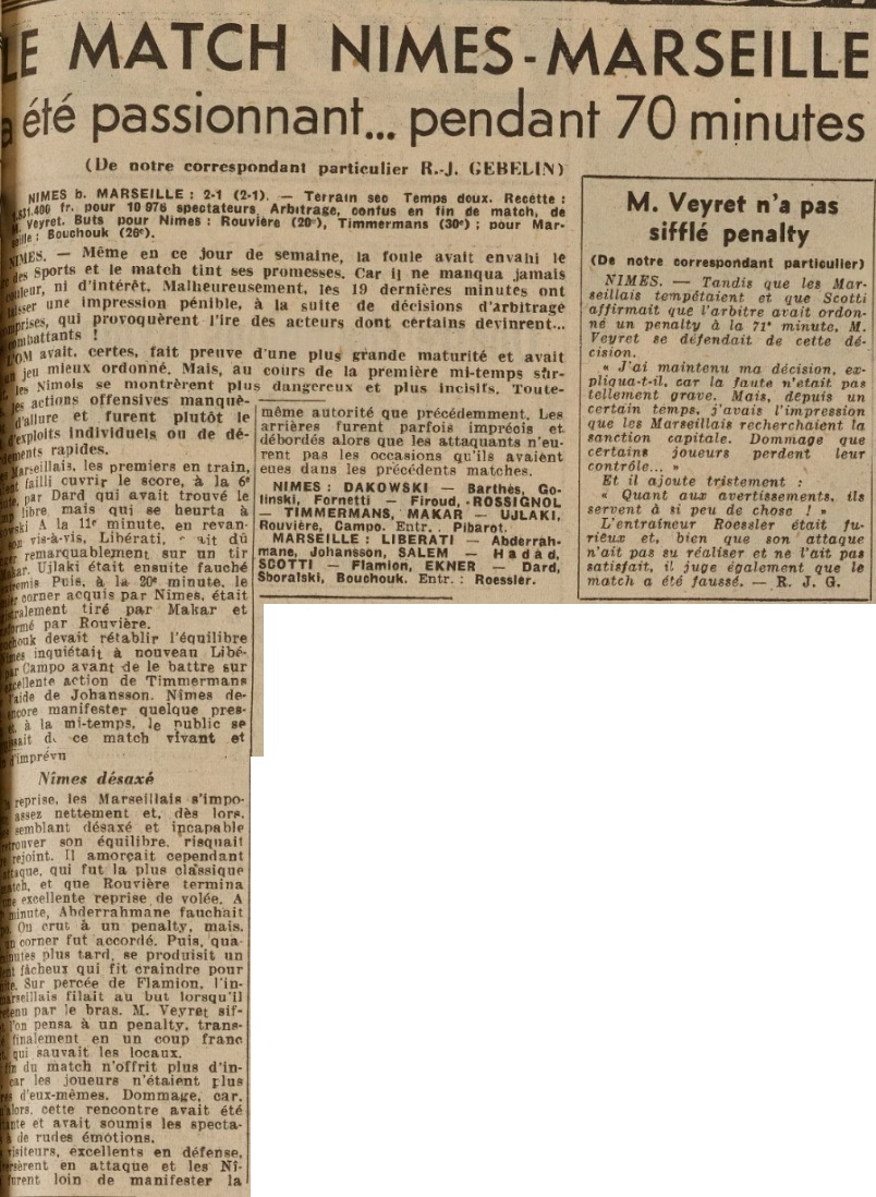 L'O.M. domina en seconde mi-temps. Au cours de seconde mi-temps, l'O.M. domina très largement son adversaire. Ce ne fut pas une pression aussi constante que dimanche devant Strasbourg, mais les Marseillais "tinrent" presque constamment le jeu. À la 65me minute, Flamion en position d'inter avancé, dribbla deux adversaires, mit la balle sur le pied gauche de Zboralki qui manqua son shoot et une superbe occasion. Six minutes plus tard se produisit un incident d'importance. Flamion, s'élançant vers les buts fut gêné par Rossignol. L'inter marseillais se plaignit d'avoir été retenu par le bras. Monsieur Veyret après avoir désigné le point de penalty fit tirer de cet endroit précis un coup franc. L'O.M. perdait là sa chance d'égalisation. Abderrahmane et Flamion. Si, du côté marseillais, la défense fit bon match, un homme en émergea cependant : Abderrahmane, qui fut bien le meilleur homme sur le terrain avec Flamion. On peut reprocher à Scotti d'avoir délaissé parfois Timmermans en première mi-temps notamment, le capitaine marseillais fut un excellent constructeur de jeu. L'attaque mena quelques actions fort bien conçues mais Dard, Zboralski et Ekner (ce dernier étant en net progrès sur son dernier match) se montrèrent imprécis dans leurs tirs. Quant à Bouchouk, isolé au début du match, il effectua un travail personnel fort méritoire. Rouvière, Dakoski Nîmes, remanié desservi par la médiocre tenue de son capitaine Firoud et l'effacement presque total de Campo devant Abderrahmane joué au-dessus de sa valeur. Les Rouvière (très dangereux) Dakoski (sur), Golinski (décidé est bien placé), Fornetti (puissant) se mirent en évidence. Timermanns eut une action précieuse mais intermittente. Makar eut des services excellents en première mi-temps. Rossignol a paru dépaysé à son poste de demi-aile. L'absence de Moureau a déséquilibré l'équipe nîmoise qui sort cependant vainqueur d'une partie que l'O.M. avec un peu plus de décision au moment de conclure eut pu enlever. |