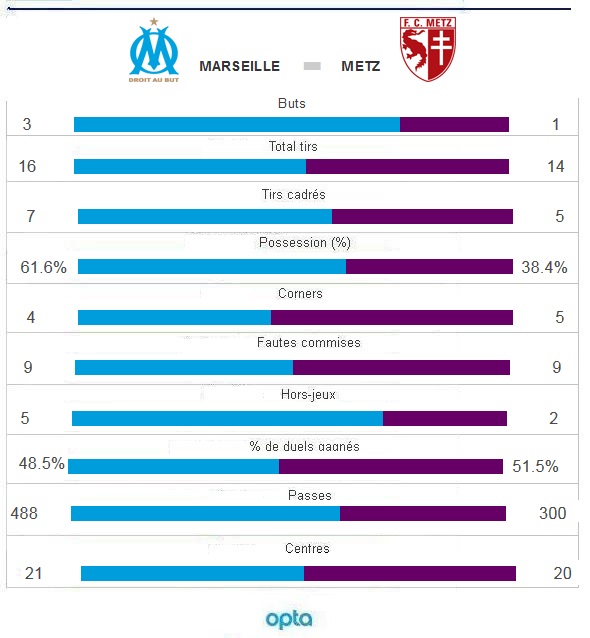 L'OM avait la pression. Relégués à la deuxième place du championnat avant la rencontre de ce soir, derrière le PSG, les hommes de Marcelo Bielsa n'ont pas craqué et sont venus à bout, difficilement certes, d'une valeureuse équipe messine (3-1). L'OM enregistre son huitième succès consécutif au stade Vélodrome et reprend par la même occasion son dû, le trône de leader de la Ligue 1. Tout ne peut pas toujours être facile pour l'OM et les Messins l'ont prouvé ce soir. Venue sans pression, l'équipe d'Albert Cartier a donné bien du fil à retordre aux Olympiens. La première mi-temps est équilibrée et pauvre en occasion. Les Olympiens sont brouillons. Thauvin tente de percuter mais il est souvent repris par la défense tandis que Benjamin Mendy est signalé en position de hors-jeu à plusieurs reprises. La première véritable occasion (34') est à mettre au crédit de Dimitri Payet, l'homme fort de l'OM, qui se décale sur son pied droit avant d'enrouler un ballon qui passe de peu au-dessus de la transversale de Johann Carrasso, petit frère de Cédric. C'est finalement le buteur maison, André-Pierre Gignac, en difficulté ces dernières semaines, qui ouvre le score en toute fin de premier acte (43'). Tout part encore de Payet, à droite, qui repique et centre vers APG qui place une tête piquée pour ne laisser aucune chance à Carrasso ! A la pause, Gignac et ses coéquipiers rentrent donc aux vestiaires avec le plus petit des avantage. Giannelli Imbula, touché et moins en vue qu'à son habitude, laissera sa place à Alaixys Romao pour la deuxième période. Une deuxième mi-temps que les Messins attaquent sur les chapeaux de roue. Et, sur le coup d'envoi (46'), Malouda hérite du ballon et tente sa chance. Son tir est malencontreusement dévié par Nkoulou qui trompe son portier. Payet, encore et toujours Le match est alors totalement relancé. Et quelques minutes plus tard (60'), c'est le revenant André Ayew, absent pendant un mois, qui redonne l'avantage aux siens. Au début de l'action, c'est encore et toujours Dimitri Payet qui fait la différence. Excentré à droite il trouve Romao plein axe. La frappe du Togolais termine sur le poteau mais le ballon revient sur Ayew qui ne rate pas la cible, du pied droit qui plus est. Metz est touché, mais pas coulé. Tout juste entré en jeu, le jeune Ngbakoto se met en évidence sur son premier ballon. Sa frappe est parfaitement détournée par le capitaine olympien, Steve Mandanda. La fin de match est hachée et les espaces nombreux. Dans les arrêts de jeu de la rencontre, toute la détermination marseillaise est encore mise en avant. Rod Fanni récupère un ballon dans le rond central et remonte le cuir avant de servir Payet sur sa sdroite. Le Réunionnais réalise une fois de plus un geste parfait en piquant son ballon au-dessus de Carrasso pour porter l'estocade. La "Metz" est dite... Moins convaincant qu'à l'accoutumée, l'OM s'offre tout de même trois points cruciaux dans sa lutte avec le PSG pour la première place dans l'élite. "El Loco" Bielsa et ses joueurs ont désormais une semaine devant eux pour se reposer, après trois matches en une semaine, avant d'affronter l'AS Monaco, dimanche prochain sur le Rocher. Auteur : Kevin Duran |