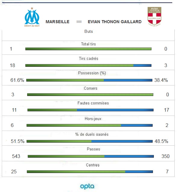 L'OM s'impose 1 but à 0 face à Evian TG grâce à un penalty transformé par Gignac en début de seconde période. Les Olympiens égalent par la même occasion un record vieux de 67 ans. "Réagissez les gars !" assènent les Ultras sur une banderole. L'attente est grande avant cette rencontre. Comme toujours ces dernières semaines, l'OM doit se reprendre au stade Vélodrome après une contre-performance à l'extérieur. La carotte est suffisante, mais la perspective d'égaler le record de onze victoires consécutives à domicile sur une saison, datant de 1948, ajoute une pointe de romantisme. Avec les retours de Fanni et Alessandrini, le onze de départ est plus classique, en comparaison à celui expérimenté à Nice une semaine plus tôt. Le jeu olympien en bénéficie rapidement. DjaDjédjé loupe même l'immanquable après seulement 10 minutes de jeu à la suite d'un centre parfait d'Alessandrini. Rien de rédhibitoire pour la victoire. L'OM étouffe son adversaire et construit patiemment ses actions, peut-être trop patiemment. Evian TG ne panique pas et fait le dos rond, bien aidé par le manque de spontanéité et de créativité des Olympiens. Du coup, les hommes de Pascal Dupraz prennent confiance et développent leurs contres sans retenue. Jouée à sur un rythme peu soutenu, la première période n'est en rien enivrante pour les spectateurs, même si le but de Thauvin, logiquement refusé pour hors-jeu, les deux têtes non-cadrées de Gignac, celle de Morel et la demi-volée de Payet, un poil trop haute, les maintiennent éveillés. L'OM détient assurément les clefs de la rencontre, avec notamment deux-tiers de la possession de balle. Il lui faut désormais s'en servir pour faire sauter le verrou haut-savoyard. Au retour des vestiaires, deux minutes suffisent à Payet pour pousser Barbosa à la faute dans sa surface. L'arbitre désigne le point de penalty. Gignac s'exécute et transforme, mettant ainsi son équipe sur la voie du succès. Le Vélodrome exulte enfin. Désormais, Evian TG ne peut plus se contenter de défendre en attendant la bonne opportunité. Le rythme du match s'accélère. A l'heure de jeu, Marcelo Bielsa fait entrer Batshuayi à la place d'Alessandrini afin d'éviter une nouvelle blessure à son ailier. La formation de Pascal Dupraz est de plus en plus joueuse et tente de revenir au score. Paradoxalement, l'OM ne parvient pas à utiliser convenablement les espaces laissés par ses adversaires et peine à se procurer de nouvelles occasions. Les Olympiens usent alors de frappes lointaines sans danger pour Leroy. Romao a bien l'occasion de doubler la mise à un quart d'heure du terme, mais sa frappe à bout portant s'envole. La volée de Gignac à la suite d'un centre de Payet connait le même sort. Dans le dur physiquement, Mendy laisse sa place à Aloé en fin de match. Morel, impeccable dans l'axe depuis le début de la rencontre, bascule à gauche pour les dernières minutes et se montre tout aussi intransigeant avec ses adversaires. En l'absence de Nkoulou, le patron de la défense c'est lui. Les minutes s'égrainent et jusqu'au bout l'OM fait bloc pour contenir Daniel Wass et sa bande. Sans briller, les Olympiens remportent leur onzième victoire consécutive à domicile en Ligue 1, égalant ainsi un record vieux de 67 ans. Auteur : Allan Chaussard |