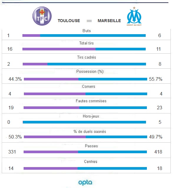 L'OM en mode rouleau compresseur Les Olympiens ont étrillé Toulouse (6-1) et s'emparent provisoirement de la seconde place de Ligue 1. 7 tirs cadrés, 6 buts marqués ! L'OM a fait preuve d'une efficacité offensive exceptionnelle sur le terrain de Toulouse, ce vendredi soir. Les Olympiens ont connu une entame de match rêvée puisqu'ils menaient au score par deux buts d'avance au bout de sept minutes. C'est d'abord Batshuayi qui s'est chargé de l'ouverture du score après un enchaînement de toute beauté (2'). Quelques instants plus tard, Aloé surgit pour inscrire son premier but en Ligue 1 (7'). Malgré cet avantage confortable, les hommes de Marcelo Bielsa ont continué à montrer leurs intentions offensives et ils furent récompensés. Le pauvre Kana-Biyik, sous la pression d'Ocampos, a poussé un centre d'Ayew dans ses propres filets (20'). A l'origine du troisième but, le Ghanéen a ensuite eu l'occasion de corser l'addition mais son tir fut détourné sur le poteau par Boucher (21'). Les Olympiens étouffent complètement les Toulousains mais vont relâcher leurs efforts et peuvent s'estimer chanceux de ne pas avoir encaissé de buts lors de ce temps faible. Le tir de Doumbia frôle le poteau (31') tandis que Pesic trouve le moyen de rater le cadre alors qu'il se trouvait au point de penalty (34'). A l'origine de ces occasions du " Téfécé ", des prises de risques inutiles de la part de Lemina et Romao, respectivement. Les Toulousains peuvent s'en mordre les doigts puisqu'ils vont encaisser un quatrième but olympien. Une contre-attaque olympienne initiée par Payet se termine par un petit numéro de Batshuayi qui dribble le gardien et inscrit son doublé (44'). Avec quatre buts d'avance à la pause, l'issue du match ne faisait plus guère de doute pour les Olympiens. Cela n'allait pas empêcher les spectateurs du Stadium d'assister à de nouveaux buts en seconde période. Si Grigore rate le cadre vers l'heure de jeu (66'), cela ne sera pas le cas de Ben Yedder qui parvient à réduire le score pour les locaux (77'). Une joie de courte durée pour les Violets puisque dans la foulée, Ayew inscrit son nom au tableau d'affichage grâce à une frappe pleine de sang-froid (78'). Juste avant le coup de sifflet final, Gignac, entré en jeu, participe à la fête en inscrivant le sixième et dernier but olympien de la soirée (89'). L'OM débute ce mois de mars de façon tonitruante et met fin à sa mauvaise série hors de ses bases. Avant ce soir, la dernière victoire à l'extérieur remontait au 4 octobre. Une éternité. Auteur : Amayes Brahmi |