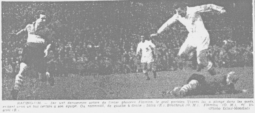 Sur centre parfait de Gudmunsson, Moreel reprend magnifiquement de la tête mais Libérati arrête magistralement. Vignal limite peu après sur une rude action de Sboralski, Flamion est bien près de marquer. Vignal lâche la balle, bafouille et Bouchouk, survenant, tire sur lui. Vignal est encore à l'ouvrage sur un tir trop en biais d'Alarcon. Echappée ultra, rapide de Moreel dont le shoot part. Libérati quoique semblant souffrir des reins, arrête au prix d'une belle détente. Le temps se couvre, pendant le repos et l'on reprend sous un ciel menaçant. Dard joue à droite. Sboralski à gauche et Bouchouk inter. Dard s'échappe et tire, mais au-dessus. Le Racing attaque mais rien ne passe. Penalty pour l'O.M. Et Soudain, tapage énorme, Vignal cafouille une balle, Bouchouk la lui dispute, les irrégularités se succèdent et finalement Bouchouk et Vignal restent tous les deux sur le carreau. Mais le Parisien est vite debout... pour essayer de parer le penalty que Scotti marque imparablement (54me minute), tandis que Bouchouk k. o. doit être soigné et revient en boitant bas. Scotti se met maintes fois en évidence. Mais la pression du Racing s'accentue et la défense olympienne est fort à l'ouvrage. Libérati bloque enfin la balle. Gundmundsson lui frictionne les côtes et s'en tire avec un coup franc, et les huées du public qui, du coup prend parti pour l'O.M. et l'encourage. Des deux cotés, les "toiles" sont nombreuses et les joueurs tombent à qui mieux mieux. On voit même deux joueurs poursuivre la balle à quatre pattes... L'O.M. a laissé passer l'orage et attaque mais Flamion opère en retrait et le manque de punch des autres est évident. La qualité du jeu a beaucoup baissé au Racing surtout ou Gundmudsson joue avant centre bientôt remplacé par Vaast |