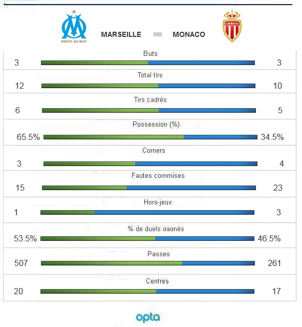 La malédiction du Vélodrome Après avoir aligné 11 victoires consécutives sur sa pelouse en 2014-15, l'OM était resté 100 jours sans gagner entre janvier et mai. Hier, avec un nouveau nul contre Monaco (3-3), le dernier succès à la maison en L1 remonte à 70 jours Transposer cela au stade Vélodrome. Après le succès de son équipe à Saint-Étienne, Michel avait émis ce souhait : que son OM se remette enfin à gagner à domicile. Et cette fois-ci, on y croyait plus que jamais depuis le 13 septembre, date de la dernière victoire de l'OM au Vélodrome en Ligue 1, contre Bastia (4-1). Il y avait de quoi y croire dur comme fer, quand Alessandrini a ouvert le score à la 12e minute, deuxième but seulement de l'OM marqué dans le premier quart d'heure en L1. Après tout, un succès sur Monaco, c'était le prolongement logique de celui acquis à Geoffroy-Guichard où, après ceux acquis péniblement à Lille et à Nantes, l'OM avait ajouté du jeu face à une bonne équipe ; auparavant, le réalisme avait suffi face aux faibles Lillois et Nantais. Et entre-temps, il y avait eu Groningen, victoire difficile à concrétiser (la deuxième toutefois en Ligue Europa au Vélodrome), mais extrêmement logique. Il y avait de quoi renverser la situation Gagner à domicile, c'est statistiquement plus fréquent et plus aisé que de le faire à l'extérieur. D'ailleurs, il y a un an, l'OM surfait sur la nouveauté de son Vélodrome où les records tombaient, à plus de 60 000 spectateurs : entre le 29 août 2014 contre Nice et le 31 janvier 2015 contre Évian TG, les Olympiens avaient aligné 11 succès consécutifs, les neuf premiers acquis pendant la phase aller étant déterminants dans le titre honorifique de champion d'automne. Et puis, tout s'est déréglé et 2 nuls et 3 défaites plus tard, il a fallu attendre le 10 mai pour voir l'OM gagner de nouveau à la maison. Cent jours qui avaient eu raison des illusions de titre, de Ligue des champions, de podium. Victoire contre qui ? Contre Monaco (2-1), arbitrée par Clément Turpin. Alors, même après l'égalisation de Touré, puis son but du 2-1, il restait de la place pour espérer un renversement de situation. Même avec 42 000 spectateurs et des brouettes (on en a bien perdu 20 000 en quelques mois...), l'ambiance était propice à une remontée. Sachant que Batshuayi et Nkoudou n'avaient pas encore marqué, ça laissait de l'espoir. Une occasion à l'ultime seconde de jeu L'espoir n'aura effectivement pas été vain. Michy a égalisé une première fois, en renardeau des surfaces et après le but surprise de Coentrao, "GK" a profité d'une frappe complètement ratée de Ocampos transformée en passe décisive pour égaliser à son tour. À 3-3, le fantôme de Lorient et du 3-5 d'avril dernier est venu rôder au-dessus des tribunes.