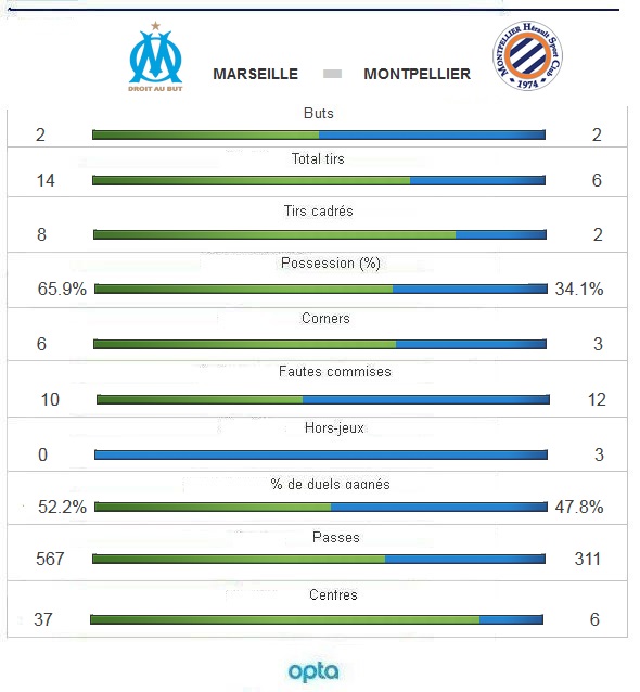 L'OM s'enlise à domicile L'OM et Montpellier se sont quittés dos à dos (2-2) au terme d'un match plaisant. Sixième match consécutif sans victoire pour l'OM à domicile... Sixième match consécutif sans victoire à domicile en Ligue 1... C'est le triste bilan de l'OM après le nul concédé ce dimanche après-midi face à Montpellier (2-2), au stade Vélodrome. Une série noire qui ne permet pas à l'OM de continuer sa remontée vers le haut du classement et qui plonge encore un peu plus les Olympiens dans le doute, eux qui ne l'emportent désormais plus qu'à l'extérieur. Le public était pourtant au rendez-vous. 41486 spectateurs venus encourager les leurs dans les travées du Vel', malgré la pluie. La rencontre commence tambour battant et l'intensité monte au fil des minutes. L'OM prend d'ailleurs clairement l'ascendant sur son adversaire et multiplie les offensives sur le but de Laurent Pionnier. Mais, presque comme à son habitude, les coéquipuiers de Steve Mandanda se font surprendre peu après la demi-heure de jeu (32'). Une passe lumineuse de Boudebouz pour Ninga qui passe devant Nkoulou avant de conclure d'un pointu devant le portier olympien. Puis, plus grand chose jusqu'à la mi-temps où les Marseillais rentrent au vestiaire sous quelques sifflets. Après la pause, Michel choisit de faire entrer Mendy et Sarr à la place de Manquillo et Romao. Un choix payant puisque après quelques secondes de jeu (48'), Sarr centre de la droite vers Barrada qui remet dans l'axe. Cabella et Batshuayi se gênent mais c'est bien l'ancien Montpelliérain qui parvient à frapper au but et vient battre Pionnier. Mais les vieux démons de l'OM ressurgissent rapidement (56'). Dans la surface, Rekik rate complètement son dégagement et c'est encore le Tchadien Ninga qui en profite et vient crucifier Mandanda avec l'aide du poteau. Heureusement, l'OM réagit et c'est Bouna Sarr qui va offrir le point du nul aux siens. Georges-Kevin Nkoudou déborde sur la gauche et centre au second poteau où Sarr arrive lancé pour placer son plat du pied et inscrire son premier but sous les couleurs marseillaises (72'). La fin de match est animée mais ne donnera pas vainqueur à cette rencontre. L'OM s'enlise encore à domicile où il n'a plus gagné depuis le 13 septembre dernier et un succès devant Bastia (4-1). Mandanda et consorts se déplaceront jeudi en République Tchèque pour arracher la qualification en Ligue Europa avant de recevoir, encore, le Gazélec Ajaccio samedi prochain. Kevin Duran |