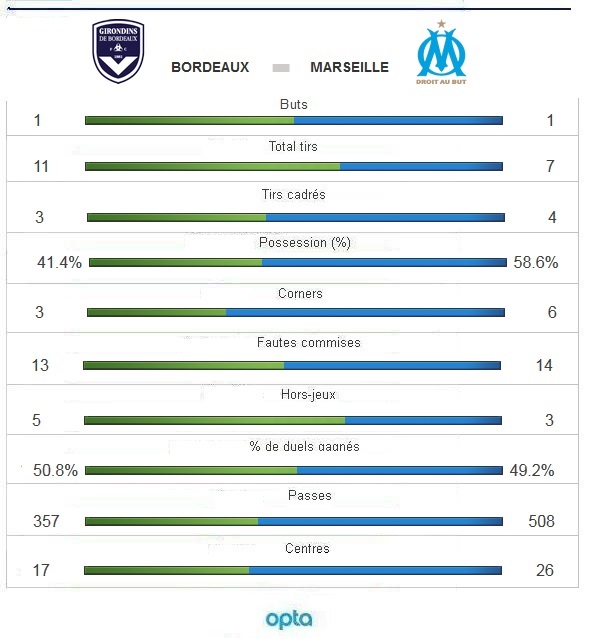 L'OM n'a, malgré le changement de stade, pas vaincu le signe indien à Bordeaux. Malgré l'ouverture du score en seconde période, les Olympiens ont encaissé un but dans la foulée. La série d'invincibilité des Bordelais à domicile face à l'OM continue mais les Marseillais n'ont pas perdu au stade Matmut-Atlantique. Les supporters olympiens, qui n'ont pas pu faire le déplacement, n'ont pas de regrets à avoir, ce n'est pas encore cette année que l'OM vaincra le signe indien. Ce n'était pas une question de stade : Lescure, Chaban-Delmas ou Matmut-Atlantique, la série noire continue... La première période ne restera pas dans les mémoires tant la maîtrise technique n'était pas au rendez-vous des deux côtés. Beaucoup de ballons perdus, peu de mouvement, des erreurs techniques, des lacunes dans la transmission, des longs ballons qui n'arrivaient pas à destination, des attaquants trop souvent hors-jeu... Il y a pourtant eu des occasions mais à l'image de la première mi-temps, elles n'ont pas été assez franches. On retiendra côté marseillais, la frappe lointaine de Barrada et la tentative de Batshuayi après un bon mouvement entre Diarra et Barrada. Les deux ont terminé dans les gants de Carrasso. Les Girondins, bien en place défensivement pendant 45 minutes, ont eu leur part du gâteau, avec, sur corner, une frappe de Saivet non-cadrée, un tir de Khazri et un autre de Ounas. On attendait beaucoup plus de la seconde période et on n'a pas été déçu ! Dès l'engagement, Mandanda se déployait face à Ounas pour sortir un ballon à bout portant. L'OM répliquait immédiatement avec une talonnade de Barrada pour Mendy qui centrait pour Batshuayi dont la reprise passait hélas largement au-dessus. Mais en quelques minutes, on en avait vu plus que lors des 45 premières. Cette bonne entame se concrétisait par l'ouverture du score marseillais. Sur un corner de Barrada, Romao, au milieu de la meute, plaçait une tête qui laissait Carrasso sur place. Mais l'avantage olympien au tableau d'affichage n'a duré que quelques secondes, quinze exactement après l'engagement. Un une-deux entre Crivelli et Khazri transperçait la défense olympienne. Le Tunisien gagnait ensuite son duel avec Mandanda. Une égalisation qui rendait Michel fou de colère... En moins d'un quart d'heure, le match s'était enfin lancé. Ce n'est pas pour autant que les occasions se sont multipliées mais le match est devenu plus plaisant. Les Olympiens ont privés les Bordelais de ballons. Les Girondins semblaient fatigués. Willy Sagnol s'en apercevait aussi et faisait des changements pour tenter de relancer la machine. Les Marseillais continuaient d'asseoir leur domination mais leurs opportunités manquaient de tranchant et ils butaient trop souvent sur une défense toujours bien organisée. Le temps fort des Bordelais en fin de partie ne leur permettait pas de prendre l'avantage. Même si Rolan touchait la transversale de Mandanda dans les arrêts de jeu. La série de quatre victoires de l'OM en déplacement prend fin avec ce nul à Bordeaux. Cela fait 38 ans et 31 matches que les Marseillais ne sont plus imposés en Gironde. Ce match nul n'arrange évidemment personne. Les Olympiens manquent à nouveau une belle occasion de faire un bon au classement et perdent même une place au championnat (10ème). Auteur : Frédéric Rostain |