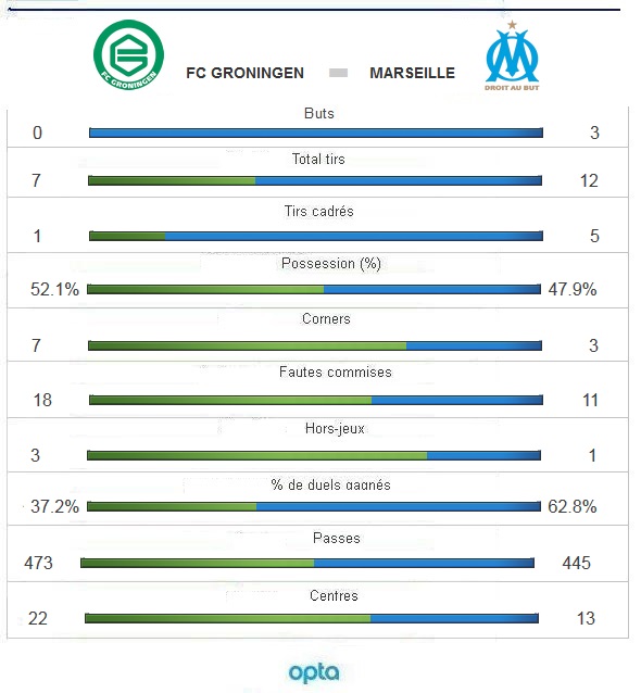 ______________________________________________________________ 4' : Servi par Lucas Ocampos, Lucas Silva contrôle et déclenche une frappe du pied droit à une vingtaine de mètres. Sergio Padt se couche et bloque en deux temps. 7' : Contre mené par l'OM et Lucas Ocampos, qui s'offre un raid en solitaire. Avant de perdre le ballon dans la surface néerlandaise. Franck Zambo avait fait l'effort et réclamait le ballon. 8' : A droite, Romain Alessandrini frappe le corner et cherche un appui au premier poteau. Sergio Padt intervient et bloque en deux temps. 10' : A droite, Bryan Linssen prend le corner et cherche Danny Hoesen, dont la reprise de la tête dans la surface olympienne n'est pas cadrée, trop enlevée. 12' : L'OM sort à nouveau en contre sur le côté gauche, où Georges-Kevin Nkoudou a fait la différence face à Hedwiges Maduro. Mais le centre à ras de terre qui suit traverse la surface néerlandaise sans trouver preneur. 15' : Sur la droite de la surface néerlandaise, Romain Alessandrini a tenté la volée du droit sur un service de Karim Rekik. Sergio Padt repousse difficilement au sol, sur sa droite. La défense de Groningue dégage dans l'urgence. 25' : Servi sur le côté gauche par Mendy, Georges-Kevin Nkoudou fait la différence, élimine plusieurs adversaires et se présente dans la surface, où il termine avec un tir croisé du gauche à ras de terre avec le poteau rentrant. 30' : En retard sur Michael De Leeuw, Karim Rekik offre un coup franc dangereux aux Néerlandais, à environ vingt-cinq mètres, dans l'axe. Danny Hoesen choisit une frappe enroulée du pied droit. Sa tentative vient flirter avec la lucarne gauche de Steve Mandanda. 33' : L'OM se fait peur. Karim Rekik, qui se complique la tâche, est rappelé à l'ordre par Steve Mandanda. Le défenseur central a manqué son intervention de la tête. 39' : L'OM se détache avant la pause au terme d'un contre bien mené. Touché par Mendy, Zambo réussit une splendide passe dans l'espace. Ocampos efface le gardien avec un grand pont dans la surface et finit de près du pied droit ! 47' : L'OM réclame un penalty que l'arbitre n'accorde pas. Sur un centre délivré à droite par Lucas Silva, Lucas Ocampos dévie de la tête dans la surface, où un défenseur néerlandais dévie de la main. L'arbitre ukrainien laisse jouer malgré les protestations ! 53' : Profitant d'une remise de la poitrine de Danny Hoesen, Michael De Leeuw déclenche une demi-volée du pied droit à une vingtaine de mètres. Le ballon fuse à droite du but olympien. 54' : Nouvelle poussée néerlandaise. Excentré sur la droite de la surface de l'OM, Hans Hateboer, gêné par le retour de Romao, n'inquiète pas Mandanda, sorti au sol, près de son poteau gauche. 61' : L'OM s'envole au terme d'une action collective initiée côté gauche. Décalé sur son couloir, Mendy centre en retrait pour Alessandrini, qui reprend sans contrôle et du gauche dans la surface. Sergio Padt est pris sur sa droite. 68' : Une passe en retrait mal assurée par Alessandrini et Groningue se montre. Après un relais à l'entrée de la surface, Michael De Leeuw croise de peu sa frappe pied droit. Au ras du poteau. 70' : Nouvelle occasion pour l'OM ! Georges-Kévin Nkoudou récupère un ballon et s'offre une longue course dans l'axe. Au terme de son effort, l'ancien Nantais choisit un tir tendu du droit. Au ras du poteau droit. 74' : Sur le corner frappé à droite par Lucas Silva, Lucas Ocampos ose le ciseau vers le premier poteau, mais rate l'interception. Georges-Kévin Nkoudou bataille au second poteau et obtient un nouveau corner. 85' : Steve Mandanda réussit une splendide manchette du bras gauche sur la frappe puissante du pied gauche déclenchée à l'entrée de la surface par Mimoun Mahi. Corner. |