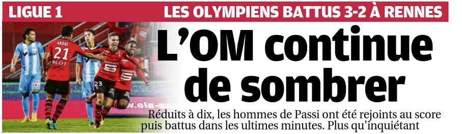 Battu dans les derniers instants, l'OM n'a pas retenu la leçon Comme à Nice, l'OM s'est incliné 3-2 en toute fin de match face à Rennes, ce mercredi soir, en clôture de la 6e journée de Ligue 1 Les Olympiens se sont inclinés 3-2 au Rohazon Park ce mercredi soir pour le compte de la 6e journée de Ligue 1. Après une défaite à Nice et une prestation indigne du niveau professionnel face à Lyon, les joueurs de Franck Passi n'ont pas rassuré, notamment dans le secteur défensif avec un Hubocan catastrophique. Sakai, lui, est sorti sur blessure au bout de cinq minutes de jeu. Hubocan, acte I Au terme d'une première mi-temps sans relief, au cours de laquelle la blessure de Sakai, remplacé par Zambo, aura finalement été l'un des tournants du match, ce sont deux erreurs défensives qui ont permis de débloquer le score. Hubocan a d'abord offert une merveille de passe décisive.. à Sio. Sur une tête en retrait totalement ratée, le défenseur central olympien a laissé l'attaquant breton filer seul au but. Plein de sang froid, celui-ci a adressé un lob parfait sur lequel Pelé n'a rien pu faire. Dans la minute qui a suivi, André s'est rendu coupable d'une faute largement évitable sur Thauvin qui a offert un penalty aux olympiens. Gomis ne s'est pas fait prier pour ramener son équipe à égalité en prenant parfaitement Costil à contrepied. Hubocan, acte II Dès le retour des vestiaires, " la panthère " a profité d'un bon ballon de Njie pour tromper Costil une seconde fois d'un plat du pied plein de sang froid et donner l'avantage aux siens (2-1, 50e). Mais à la 65e minute, Machach écope d'un carton jaune, son deuxième en cinq minutes qui lui vaut un carton rouge. Franck Passi va alors devoir composer. Il décide de faire passer Sarr, qui venait de rentrer, au poste d'arrière-droit pour permettre à Zambo de remonter au milieu de terrain. Mais sans arrière-droit de métier, l'OM va prendre l'eau en toute fin de match. D'abord, par un second coup d'éclat d'Hubocan qui a offert un penalty à Rennes en venant faucher Baal pour couvrir Sarr. Grosicki parvient à tromper Pelé et à ramener les Bretons à hauteur (2-2, 86e). Puis, par un long ballon à destination du même Grosicki, parti dans le dos de Sarr, qui adresse un centre parfait pour Hunou qui s'impose de la tête pour crucifier Pelé et offrir la victoire à Rennes (3-2, 88e). Passi : "Pas suffisant" Comme à Nice, donc, les Olympiens ont fait preuve d'une incroyable fébrilité alors qu'ils menaient au score. L'OM est donc quinzième de Ligue 1, avec un seul point d'avance sur Lille, premier relégable et ex aequo avec les Nantais que les Olympiens affronteront ce dimanche, à 20h45 au Vélodrome. Auteur : Benoit Vinstock |