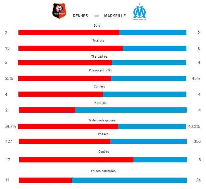 Tout bascule en 2 minutes L'OM, réduit une demi-heure durant, a mené au score à Rennes pendant 36 minutes, avant de craquer en deux minutes sur deux erreurs défensives. Il manque peu mais l'OM n'y arrive pas. Et pourtant, on y a longtemps cru. Non, ce n'est pas encore l'heure, elle n'a pas sonné. La soirée est décevante au niveau du résultat, forcément. Comment peut-il en être autrement quand on mène à l'extérieur et que tout s'écroule en deux minutes, si près du coup de sifflet final ? La soirée est frustrante tant on a longtemps cru à mieux, même à dix, car en infériorité numérique l'OM a été plus soigneux dans les phases de conservation. Pour son troisième déplacement, l'OM a encore marqué. Pour la deuxième fois consécutive, l'OM a inscrit deux buts à l'extérieur, mais cela ne suffit pas. Pas pour l'instant. A l'image de la soirée, en somme. Quant à la 41e minute, Sio ouvre le score en lovant Pelé à la suite d'une passe de la tête pas assez appuyée de Hubocan, l'heure est à la déception. D'accord, Rennes a exercé d'entrée un pressing important, provoquant de nombreuses pertes de balle olympiennes sur les relances, mais l'intensité imposée par la formation de Christian Gourcuff s'avère stérile, en raison notamment d'une approche offensive stéréotypée trop souvent axée sur la sollicitation de Ntep. Décevant disions-nous car avec une possession de balle supérieure sur les 45 premières minutes (49-51), plus de frappes (3 contre 4), l'OM est parvenue à sortir progressivement la tête de l'eau. En récupérant plus de ballons, en améliorant la relation technique, les Olympiens ont réussi à avancer sans non plus être efficaces dans les derniers gestes à l'approche de la surface. Mais il y a eu une erreur, une première. Il y a quand même eu des nouvelles positives dans la soirée : l'égalisation rapide, moins de deux minutes après le but rennais, à la suite d'un penalty provoqué par Thauvin, efficace dans ses courses intérieures. Le deuxième but de Gomis 5 minutes après la reprise, avec une projection violente et efficace, contrariant Rennes, reparti pied au plancher. S'ils semblaient faire face après l'expulsion de Machach, la faute de Hubocan dans la surface a semblé jeter une pierre sur la tête des Olympiens, combatifs à souhait pour préserver leur acquis. Deux buts en deux minutes ont anéanti une soirée pourtant pas trop mal construite jusqu'ici. Mais les erreurs individuelles ont été trop lourdes à porter. Pour les Olympiens, répétons-le, ce n'est pas encore l'heure. Pas encore. Mais ce n'est pas le moment de baisser la tête... Auteur : Thierry Muratelle |