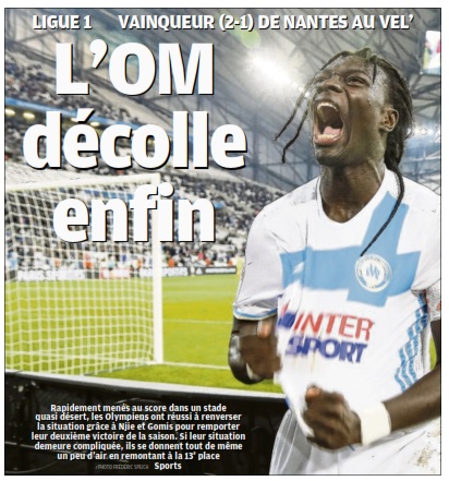 Une bouffée d'oxygène LIGUE 1 Logique vainqueur de Nantes (2-1), l'OM signe son deuxième succès de la saison et respire un peu mieux avant de se rendre à Angers, dimanche On a besoin de vous, les gars !" Le cri du coeur est signé Basile Boli. Une poignée de minutes avant le coup d'envoi de cet OM-Nantes crucial pour la suite de la saison, l'éternel buteur de Munich appelle à l'union sacrée, y compris du côté des journalistes. Du haut de son immense expérience, il sent que la situation peut rapidement échapper à Franck Passi et ses hommes, qu'une nouvelle contre-performance face aux Canaris les plongerait dans un abîme de doutes et un tourbillon de critiques. Que Bafétimbi Gomis et ses camarades ont besoin d'un petit coup de pouce du destin, si capricieux et si cruel jusqu'ici, pour se lancer enfin et respirer un peu mieux. Hier soir, dans un stade Vélodrome tristement dépeuplé, les Olympiens ont enfin eu ce soupçon de réussite. Pas grâce à l'intervention divine d'un plumitif aux écrits conciliant. Non, ce matin, ils peuvent embrasser la barre transversale de Yohann Pelé qui a renvoyé une frappe violente de Guillaume Gillet (79). Ils peuvent également claquer une bise à Lionel Jaffredo qui aurait pu siffler un penalty pour une main -certes involontaire - de Matheus Doria dans sa surface (86), puis lorsque Tomas Hubocan, encore lui, a accroché Amine Harit un peu plus tard. Les Nantais ont eu beau pester, rien n'y a fait. Il était écrit que cette soirée serait celle de l'OM qui, un mois après son succès contre Lorient (2-0), empoche sa deuxième victoire et s'offre une véritable bouffée d'oxygène, mais aussi une semaine de répit avant le déplacement à Angers, dimanche. Tout n'a pas été parfait, loin de là, et l'OM a tremblé aux deux extrêmités de cette rencontre. Par sa propre faute, au tout début, lorsque l'inattendue doublette Sakai-Fanni a joué au Père Noël coup sur coup :en se faisant déposer par un Canari d'abord, avant de lâcher le marquage sur le corner suivant converti en but par Sala (2).Un nouveau problème de concentration auquel Passi devra rapidement remédier, lui qui a révélé qu'il allait faire appel à des intervenants extérieurs pour épauler ses troupes et les guider vers la lumière. En fin de match, l'inquiétude a régné, lorsque les Olympiens ont abandonné le ballon à leurs adversaires, demeurant sous la menace d'une égalisation. Les fantômes Nice et de Rennais devaient rôder. Mais la bande à Gomis, encore monstrueux de générosité et d'efforts, les a chassés. Elle a résisté jusqu'au bout et préservé un avantage chèrement acquis par Clinton Njie (22) et l'inévitable Varois sur un penalty obtenu par ses soins (56). L'addition aurait même pu être plus corsée sans deux ratés incroyables de ce même Gomis, du gauche (36)puis de la tête (48), et avec un peu plus de discernement du corps arbitral. Njie aurait dû inscrire un doublé mais l'un des assistants de M. Jaffredo, Frédéric Haquette, a signalé un hors-jeu inexistant(27). Au final, ce succès est amplement mérité face,il est vrai, à un rival extrêmement faible, doté d'une attaque souffreteuse (3 buts inscrits en 7sorties). Il va faire un bien fou au moral de Passiet à celui de ses ouailles, capables, par moments, d'offrir de belles séquences de jeu hier soir. Mais il appelle déjà une confirmation. Avant de se pencher sur la suite du programme, le Biterrois peut relever plusieurs satisfactions. Rod Fanni, qui fêtait son grand retour contre Nantes, fait la paire avec Doria en charnière ; Vainqueur monte en puissance dans l'entre jeu et on ne peut s'empêcher de penser que lorsqu'il sera aligné avec Diarra (si son dos le laisse un jour tranquille), ce duo fera très mal à ses adversaires ;devant, la fougue de Thauvin et l'impact de Gomis se révèlent précieux. En fait, les Olympiens ont seulement besoin d'élever leur niveau, tous ensemble, pour que cette saison de transition ne rime pas avec désillusion. Auteur : Fabrice LAMPERTI |