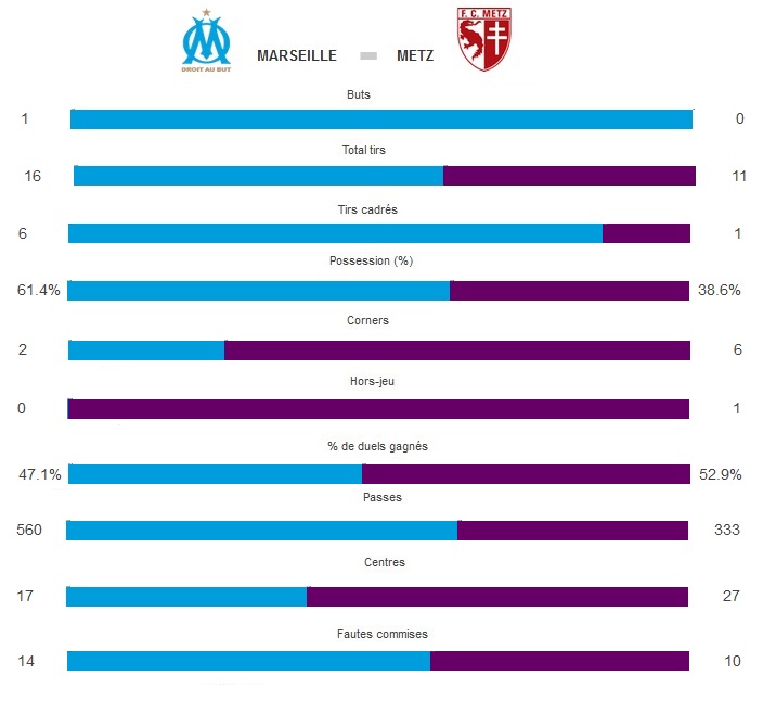 Il conviendra d'attendre pour atteindre la barre des 3800 buts inscrits par l'OM en Ligue 1. Ce cap aurait pu être franchi ce dimanche si, à l'exception du 3799e but, celui de la victoire, l'une des sept autres occasions franches de la première période avait été concrétisée. Il n'en a rien été. C'est le bémol de la soirée. Le record historique de matches joués en Ligue 1 est néanmoins bonifié par un succès. Etriqué, mais suffisant pour s'éloigner de la zone rouge, car l'OM remonte à la 12e place. L'OM a présenté deux visages. Celui de la première période, entreprenant, assez offensif, avec une entame intéressante et une présence fréquente dans la surface de réparation adverse. L'équipe a eu la bonne idée d'ouvrir le score sur son premier corner, quand bien même Gomis, deuxième buteur de Ligue 1 ce dimanche avec sa sixième réalisation, s'y est repris à deux fois, contrarié dans un premier temps par un arrêt sur sa ligne de Didillon. On insiste, le score aurait pu être plus large à la pause : sept occasions, c'est beaucoup quand un pourcentage de réalisme conséquent n'est pas au rendez-vous. Cela souligne aussi le travail de finition à soigner lors des prochaines semaines, mais cela s'avère peu car sans la sortie de Pelé dans les pieds d'Erding, tout aurait pu être remis en cause. Dans l'animation, dans les intentions, l'OM a profité quarante-cinq minutes durant de Messins frileux, attentistes, plus portés par le contre. On s'en est rendu compte, un but ne suffit pas à apporter de la sérénité car nous n'avons jamais senti les Olympiens véritablement à l'abri. Après la pause, le bloc en 4-4-2 lorrain est montré d'un cran, a mieux chassé pour contrarier les premières passes de progression olympiennes et l'équipe de Franck Passi a plus souvent été sur le reculoir. Les relations techniques ont été plus approximatives, les décalages sur les côtés plus rares, les percussions moins franches et l'OM, dont on admet deux nouvelles occasions par Gomis et Thauvin coup sur coup, n'a jamais été en mesure de respirer. Cela a apporté un certain suspense à la rencontre. Les applaudissements du stade Vélodrome au coup de sifflet ont certes salué la satisfaction de voir les Olympiens s'imposer pour la deuxième fois d'affilée à domicile, une première cette saison, mais dans la clameur finale nous avons entendu le souffle du soulagement. Pour Franck Passi, l'objectif clairement annoncé était de s'imposer. L'objectif est atteint à l'heure où un nouveau cap est franchi... Auteur : Thierry Muratelle |