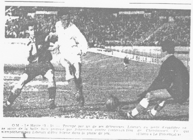 Sa présence c'est avérée utile. Flamion a mieux joué en deuxième mi-temps qu'en première ; Nocentini s'est montré plus autoritaire qu'à l'ordinaire et toujours appliqué quant à Dard il a étalé une indéniable bonne volonté. En défense en dehors de Johansson, Salem a été le plus brillant. Ce diable noir c'est littéralement déchaîné et à paru se multiplier sur le terrain. On aurait cru qu'il été omniprésent. Il a réussi des reprises acrobatiques d'une virtuosité incomparable. Le voyage dans le Moyen-Orient lui a été profitable ! Les Normands sont fatigués Les Havrais n'ont pas joué en leaders. A aucun instant nous ne les avons vu opérer avec fermeté et décisions. Battus dans tous les compartiments du jeu, dispute de la balle, rapidité d'intervention et de course, technique individuelle et collective, en dépit d'un penalty sévère et d'une tête malchanceuse de Palluch, ils ne pouvaient espérer combler leur handicap. Nous avons contemplé une équipe fatiguée qui, en défense, a cafouillé à plusieurs reprises, et en attaque a hésité à mettre de l'indécision. Cette lourdeur, cette absence de réflexe est la conséquence : 1 D'un titre très difficile à porter ; 2 de la fatigue de ses sept internationaux ; 3 D'une pauvreté en réserves de qualité. Ruminski, dans les bois, s'est défendu avec un courage magnifique. Ses sorties décidées, ses dégagement prodigieux de 70 mètres ont été appréciés. Besse et Albanesi ont été moyens, Dans l'attaque Christiansen s'est demené mais il était trop seul, mal soutenu. Il serait imprudent après ce succès d'entamer un "Te Deum" mais nous devons constater que le team phocéen s'améliore et semble en passe de découvrir une formule sinon idéale du moins très satisfaisante.