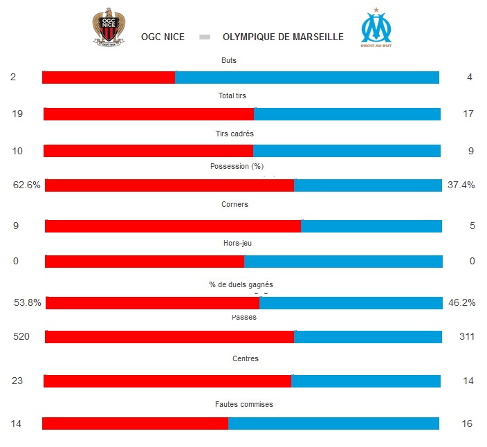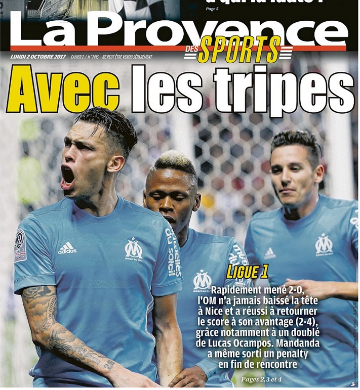 Menés 2-0 après un quart d'heure de jeu, les Olympiens ont réussi une improbable "remontada" pour dominer les Aiglons sur la pelouse de l'Allianz Riviera (2-4) On s'attendait à une rencontre haletante, à rebondissements. Le derby de la Méditerranée a tenu toutes ses promesses ce dimanche soir sur la pelouse de l'Allianz Riviera lors de la 8e journée de Ligue 1. Mené 2-0 après un quart d'heure de jeu, l'OM a littéralement renversé une équipe azuréenne pourtant dominatrice en première période. Un succès 4-2 qui permet aux Olympiens de monter sur le podium et d'aligner une troisième victoire consécutive en Ligue 1, après celles à Amiens (0-2) et face à Toulouse au Vélodrome (2-0). Dès l'entame de match, les Niçois ont pris l'ascendant sur les joueurs de Rudi Garcia. Sur un corner de Lees-Melou, Mario Balotelli a ouvert le score d'une reprise de la tête décroisée dans la surface de réparation de Steve Mandanda (1-0, 4). Peu après le quart d'heure de jeu, Jean-Michaël Seri a trompé la vigilance du gardien olympien, avec l'aide d'Adil Rami, sur une frappe des 25 mètres (2-0, 16). Ces deux réalisations symbolisaient alors parfaitement l'efficacité des Aiglons. Ocampos sonne la révolte Contre le cours du jeu, l'OM revenait alors dans la partie grâce à l'Argentin Lucas Ocampos, bien placé pour tromper Cardinale, le gardien azuréen, d'une reprise de volée à bout portant (2-1, 26). Les Olympiens ont ensuite égalisé avec l'aide de Lees-Melou, le milieu de terrain niçois, buteur contre son camp (2-2, 40). Juste avant la pause, l'OM poursuivait sa remontée incroyable. Lucas Ocampos, encore à l'affût, inscrivait le troisième but des Marseillais (2-3, 44). Un Mandanda des grands soirs Au retour des vestiaires, l'OM a réenclenché la vitesse supérieure. Et, à la suite d'une récupération haute, Luiz Gustavo a trompé Yohan Cardinale pour la quatrième fois de la rencontre d'une frappe du pied gauche à l'entrée de la surface de réparation (2-4, 48). Jusqu'à cet instant, le scénario de ce derby de la Méditerranée était complètement fou. Mais malgré l'expulsion de Luiz Gustavo pour un tacle en retard sur Lees-Melou (67), l'OM parvenait à ne plus encaisser de buts. En infériorité numérique, les coéquipiers de Dimitri Payet ont subi un penalty, après une faute de Sertic sur Saint-Maximin (83). Mais ils ont pu compter sur un Steve Mandanda décisif devant Alassane Plea afin de conserver leurs deux buts d'avance. Avec ce succès en terre azuréenne, l'OM tient son match référence face à une grosse écurie de la Ligue 1. Il monte (même) sur le podium avec 16 points au compteur après 8 journées disputées. Les Olympiens reviennent à trois longueurs des Monégasques, devancent Lyon de trois unités et Nice de six points. Mieux encore, la formation de Rudi Garcia aligne sa troisième victoire consécutive en Ligue 1. C'est bon pour le moral et la confiance, juste avant la trêve internationale.. Auteur : Pierre-Antoine Trossero |